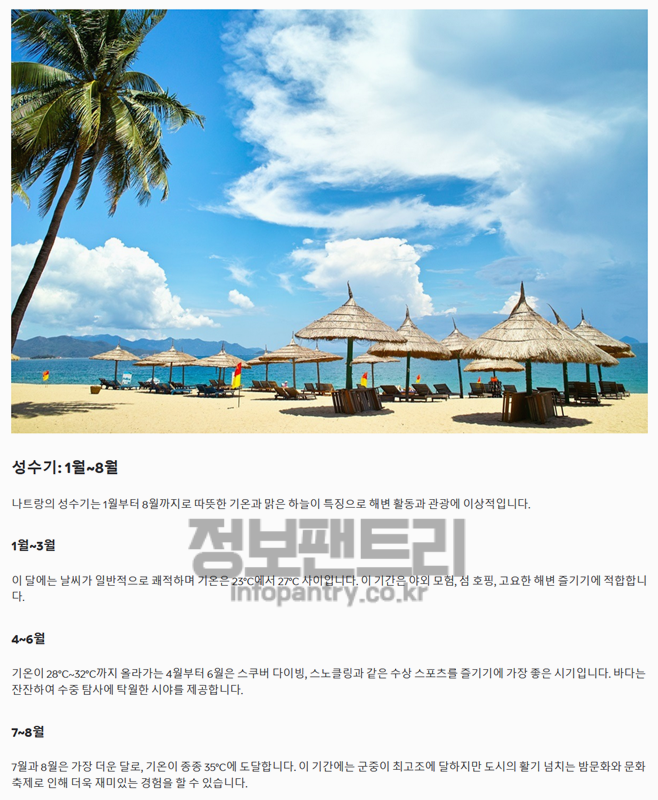 3. 여행 시기 가이드를 살펴보면 나트랑의 성수기는 1월부터 8월까지로 이 기간 동안 따뜻한 날씨와 맑은 하늘이 이어져 여행하기 좋습니다. 1월에서 3월은 기온이 23~27°C로 비교적 선선해 해변에서 여유롭게 쉬거나 섬 투어를 하기에 좋은 시기입니다. 4월부터 6월까지는 기온이 28~32°C로 올라가며 바닷물이 맑고 잔잔해 스쿠버 다이빙이나 스노클링을 즐기기에 적합합니다. 7월과 8월은 낮 기온이 35°C까지 오르며 여행객이 많아지지만 활기 넘치는 거리와 다양한 축제로 더욱 즐거운 분위기를 느낄 수 있습니다.