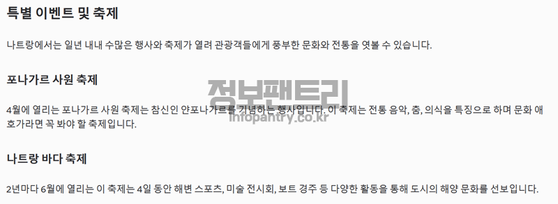 5. 일 년 내내 다양한 행사와 축제가 열려 지역의 문화와 전통을 가까이에서 경험할 수 있습니다. 포나가르 사원 축제는 4월에 열리며 참족의 신인 얀포나가르를 기리는 행사입니다. 이 기간 동안 전통 음악과 춤, 의식이 진행되어 독특한 문화적 매력을 느낄 수 있습니다. 나트랑 바다 축제는 2년마다 6월에 개최되며 4일 동안 해변 스포츠, 미술 전시회, 보트 경주 등 다양한 프로그램이 펼쳐집니다. 바다를 주제로 한 행사들이 이어져 활기찬 분위기를 즐기기에 좋습니다.