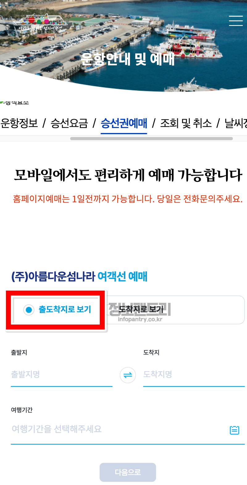 1. 승선권예매 바로가기로 들어가셔서 출도착지로 보기를 선택해보세요.