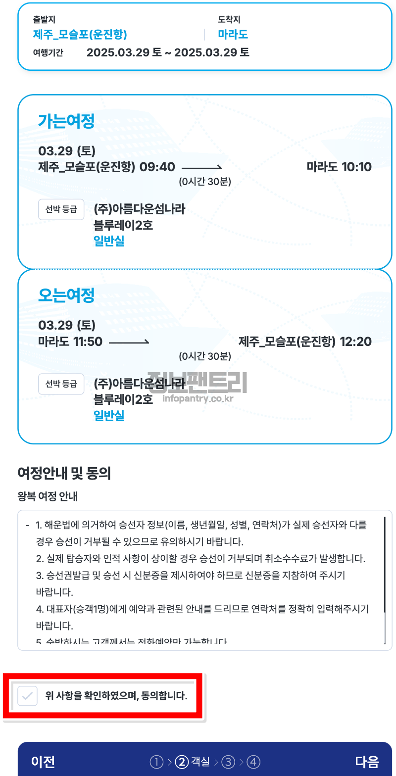 9. 가는배편 오는배편 시간과 선박등급, 객실명 잘 확인 하시시구요, 동의사항에 체크 하시고 다음 진행 해줍니다.