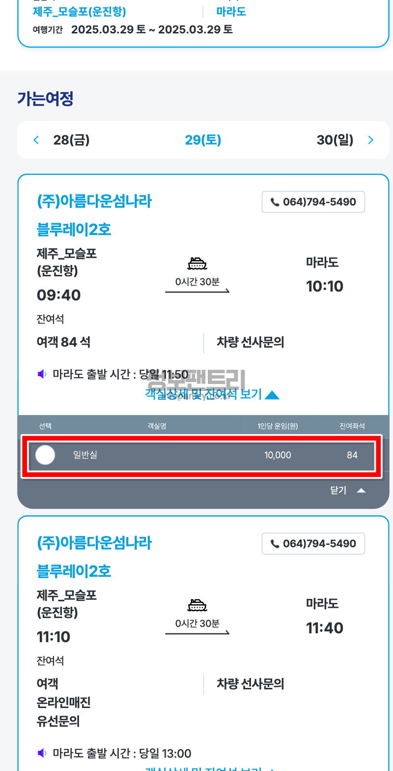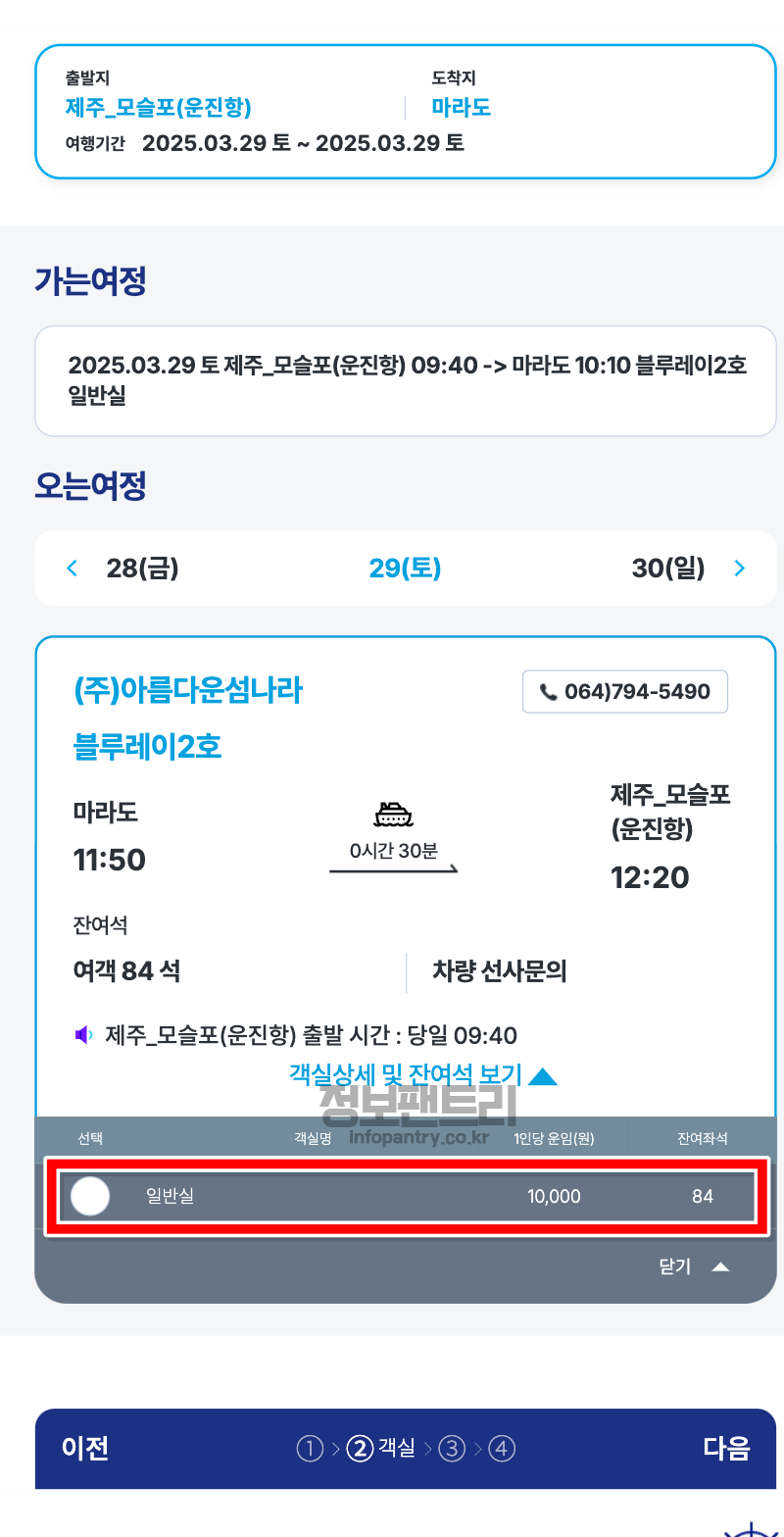 7. 이제 가는 배편을 선택하는 화면이 나와요. 출발 시간과 도착시간, 객실명과 잔여객석, 운임료 금액을 확인하시고 원하시는 객실을 선택해보세요.