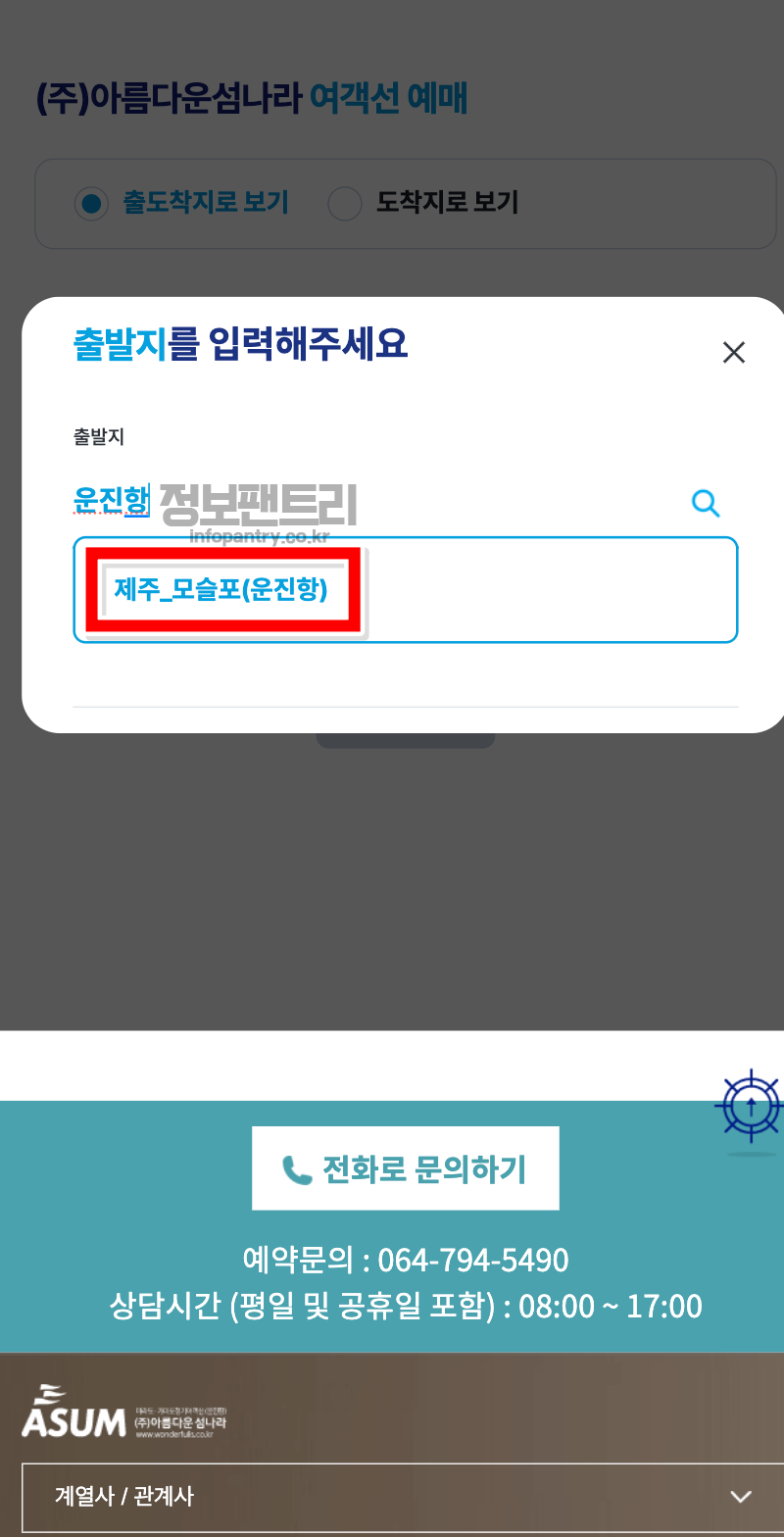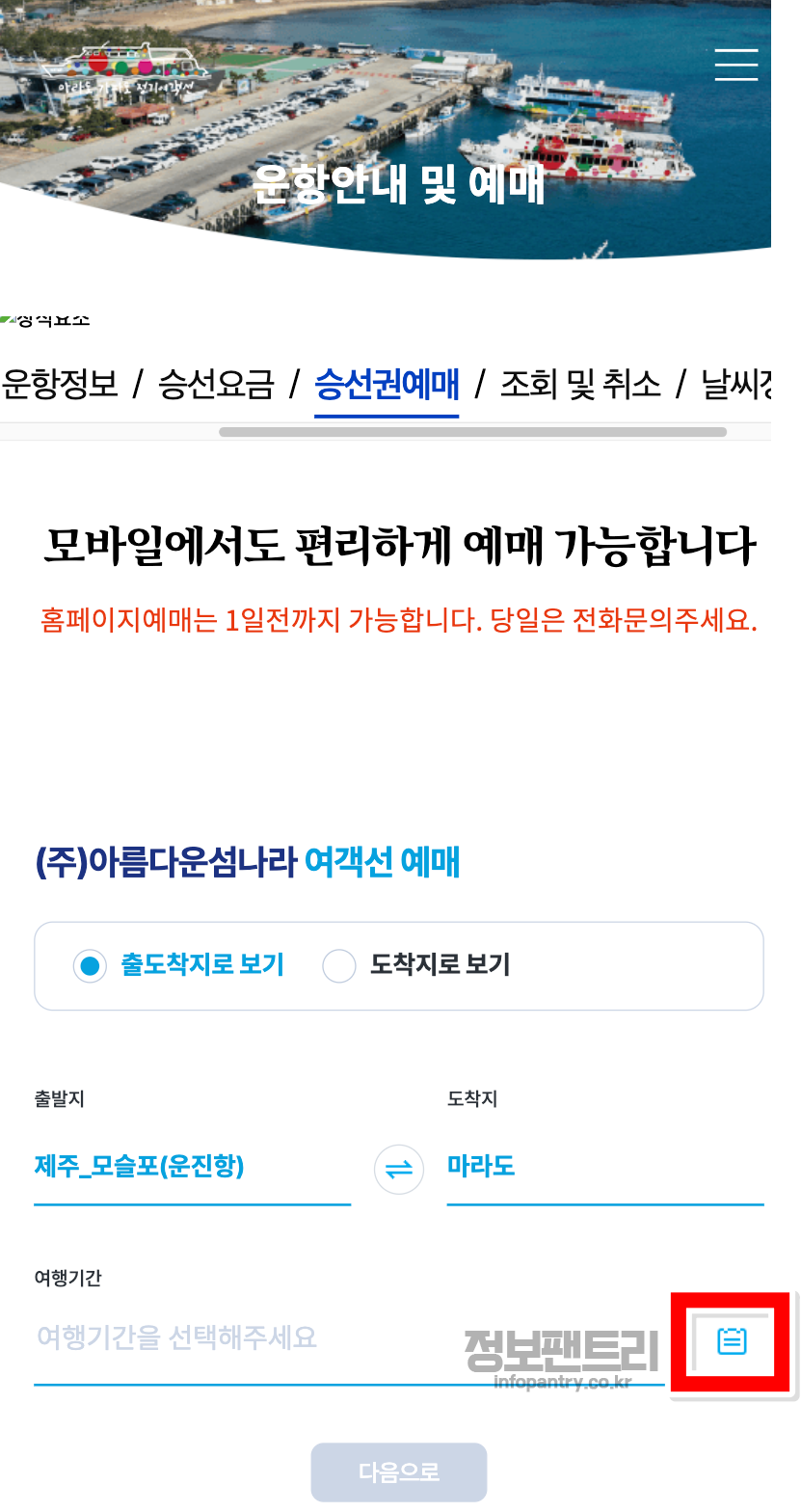 3. 출발지 항구명을 선택하시면 자동으로 도착지가 뜨는데요, 마라도를 선택해주세요.