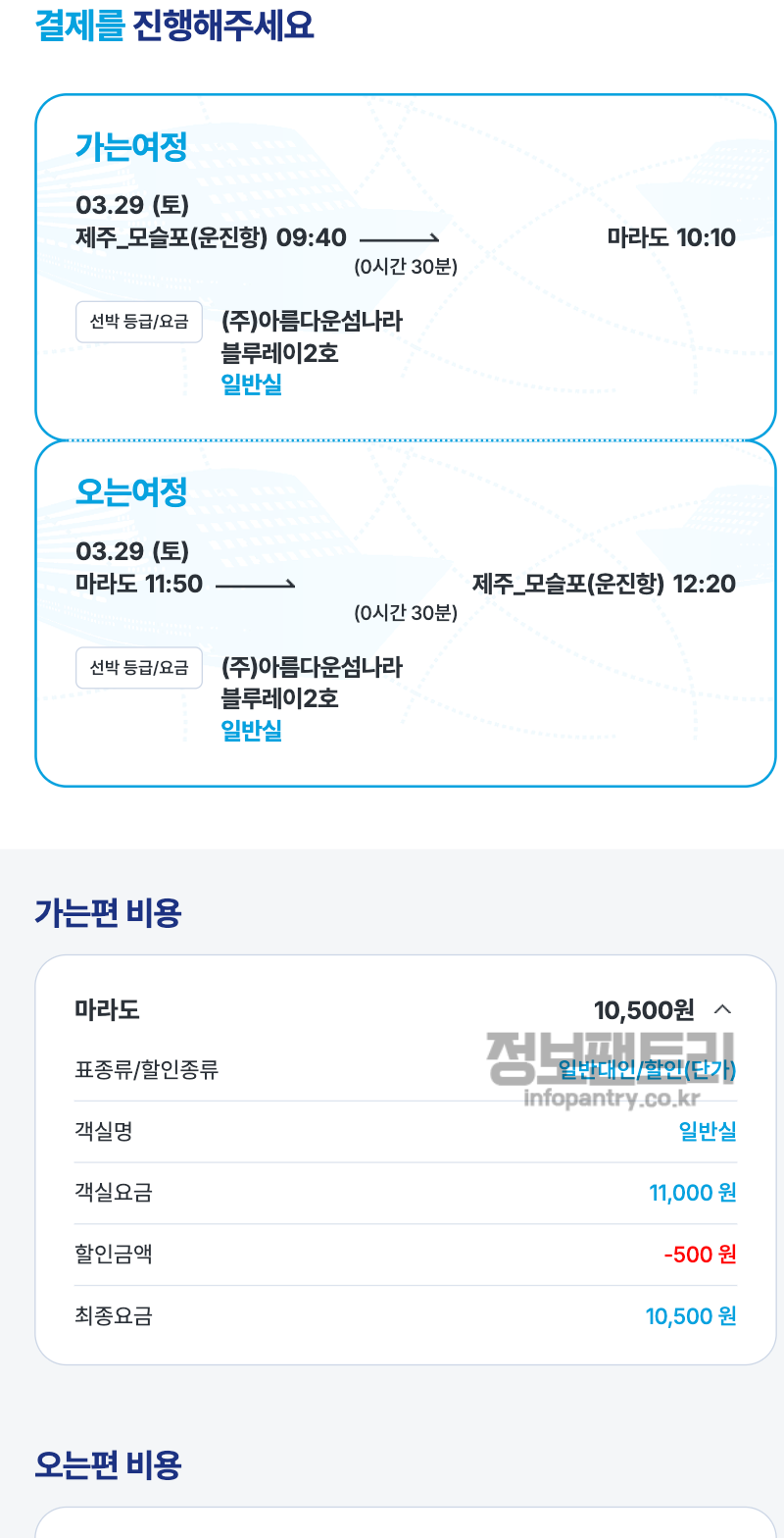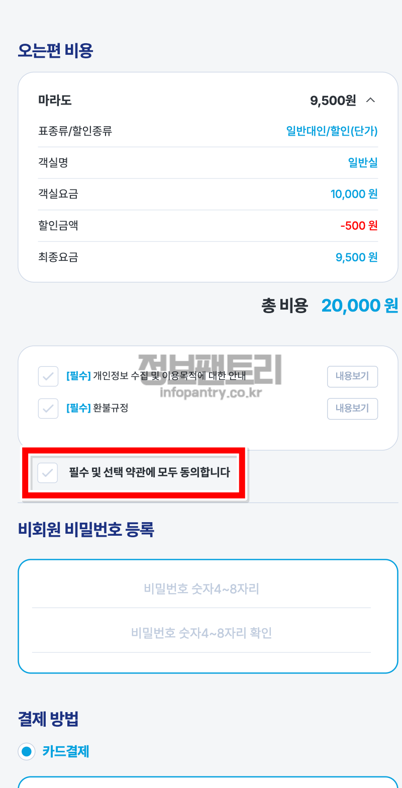 11. 마지막 결제단계인데요, 가는여정 오는여정 배편과 시간 마지막으로 한 번씩 해주시구요, 가는편 비용 오는편 비용 확인 후 필수 동의사항에 체크 해주시고, 카드결제 정보 입력 후 결제 진행 하시면 예매가 완료됩니다. 🤗