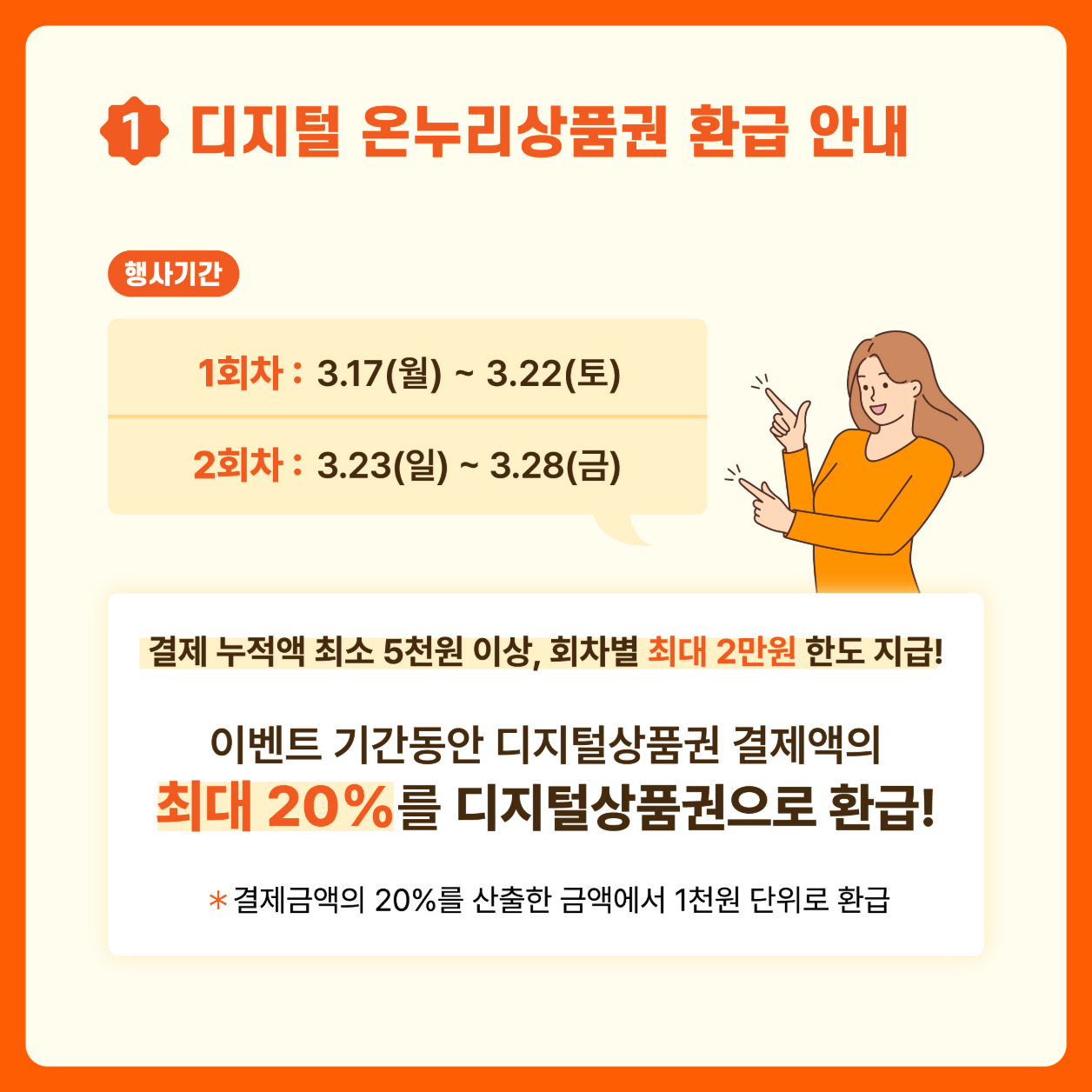 행사 기간은 1회차 3월17일 ~ 2월 22일 / 2회차 3월23일 ~ 3월28일 까지 진행중이며, 이벤트 기간동안 디지털 온누리상품권 결제액의 최대 20%를 디지털상품권으로 환급받으실 수 있답니다. 🥳