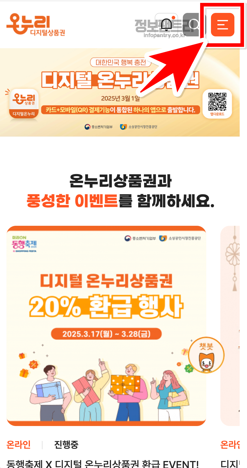 1. 온누리 홈페이지로 들어가세요. 오른쪽 위쪽에 보시면 메뉴아이콘이 있어요.