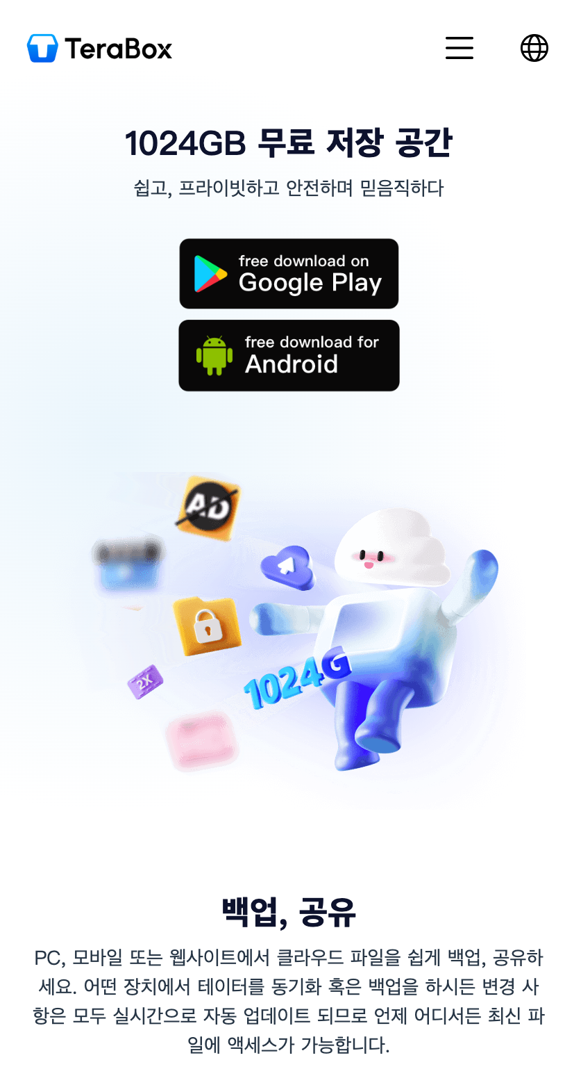 테라박스는 대용량 파일 저장에 특화된 클라우드 서비스예요. 가장 큰 특징은 무료로 1TB(1024GB)의 대용량 저장 공간을 제공한다는 점이에요. 사진, 동영상, 문서 같은 다양한 파일을 업로드할 수 있고, 스마트폰과 PC에서 모두 사용할 수 있어요. 기본적인 클라우드 기능 외에도 자동 백업, 파일 관리, 동영상 스트리밍 기능 등을 지원해요. 다만 중국 서비스이기 때문에 해외 클라우드 서비스를 꺼려 하시는 분들은 이 점 유의하셔야겠어요.