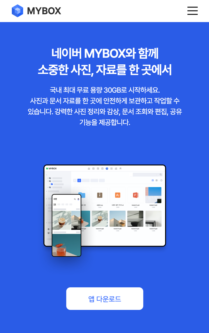 네이버 MYBOX는 네이버에서 운영하는 클라우드 스토리지 서비스예요. 네이버 아이디만 있으면 누구나 쉽게 이용할 수 있고, PC와 스마트폰에서 편리하게 파일을 저장하고 불러올 수 있어요. 사진, 동영상, 문서 등 다양한 파일을 보관할 수 있어서 개인 용도로 사용하기에 적합해요. 특히 네이버 서비스와 연동이 잘되어 있어서 네이버 메일이나 메모 앱과 함께 활용하기에도 좋고 무엇보다 무료로 제공하는 기본 용량이 30GB로 구글 드라이브의 2배나 되기 때문에 높은 용량이 필요하신 분들께 추천드려요.