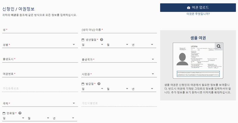 6. 이름, 성별, 생년월일, 출생국, 여권번호, 발급일, 만료일 등을 순서대로 입력해 주세요. 모든 항목은 영문으로 써야 해요.
