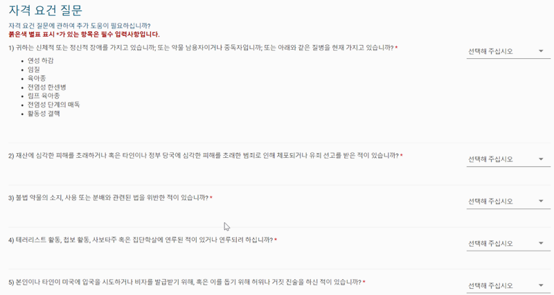 9. 연락처, 비상 연락인, 숙소 주소 같은 항목을 차례로 입력한 다음 마지막으로 간단한 자격 관련 질문에 답해주시면 돼요.