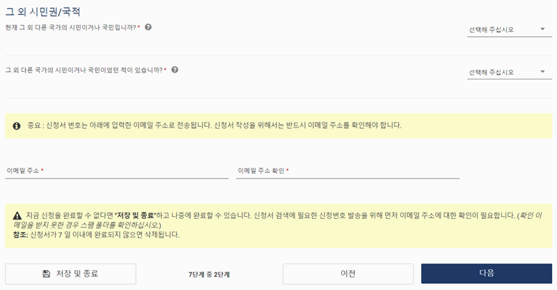7. 국적과 시민권 관련 항목에 체크하고 이메일 주소도 입력해 주세요. 이메일은 확인용 코드 수신에도 꼭 필요해요.