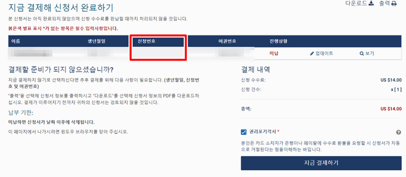 10. 모든 내용을 다시 확인한 다음 결제 화면으로 넘어갑니다. 비용은 14달러이고 신청번호는 꼭 따로 메모해 두셔야 해요.