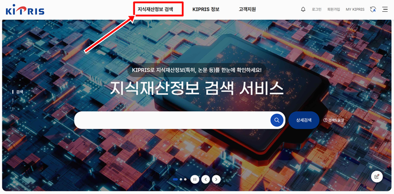 1. 특허청에서 운영하는 사이트로 특허, 상표, 디자인 같은 권리 정보를 누구나 쉽게 찾아볼 수 있도록 만들어졌어요. 메인 화면에 들어가면 위쪽에 여러 메뉴가 보여요. 그중에서 지식재산정보 검색을 눌러 선택하면 조회 화면으로 이동할 수 있어요.
