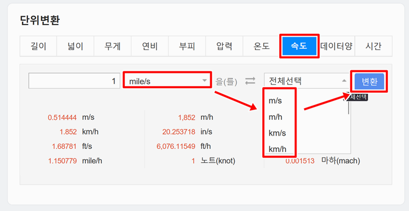 4. 속도도 바꿔볼 수 있어요. mile/s나 mile/h 같은 항목을 고르고 반대편에는 m/s나 m/h를 고른 뒤 바꾸기를 누르면 단위가 깔끔하게 변해요. 사용 방법도 어렵지 않아요.
