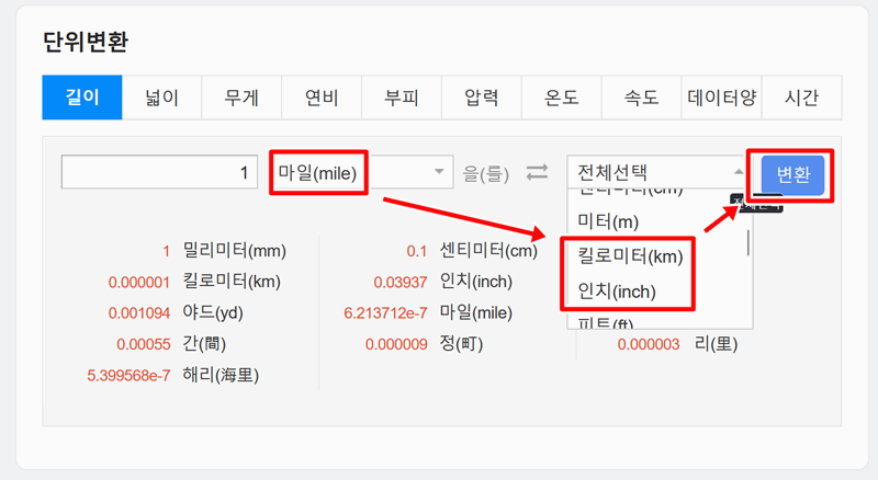 2. 1마일이 몇 킬로미터인지 알아보려면 단위변환 메뉴에서 마일을 왼쪽에 선택하고 오른쪽에는 미터나 킬로미터를 골라주시면 돼요. 순서대로 골라주는 것만으로 변환이 바로 됩니다.