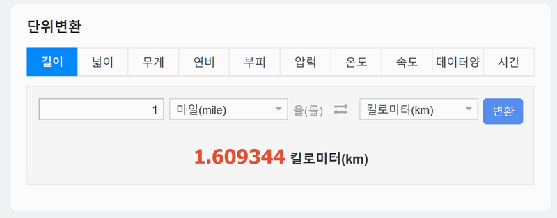 3. 검색을 해보면 1마일은 1,609.344미터이고 킬로미터로는 1.609344km라는 정확한 수치를 확인하실 수 있어요. 숫자가 낯설더라도 눈으로 보면 금방 감이 오실 거예요.