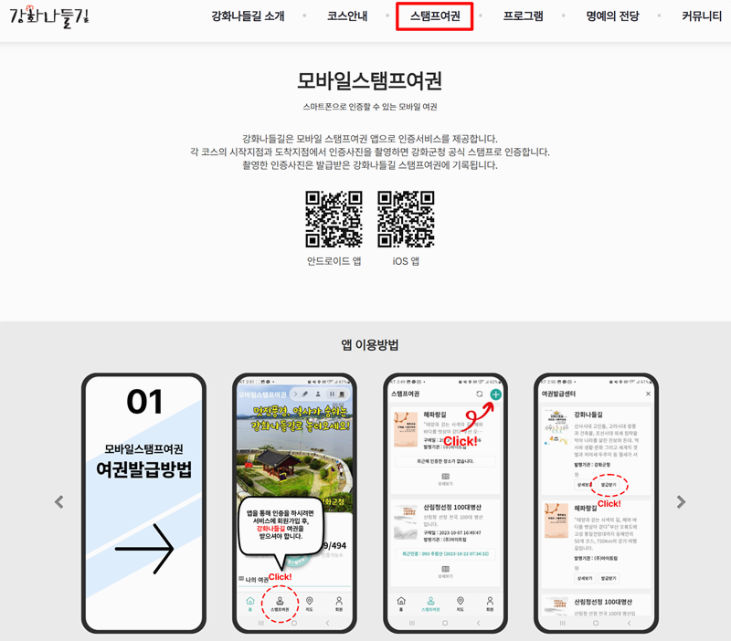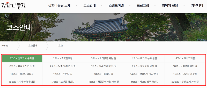 2. 강화나들길 홈페이지에 들어가면 전체 코스부터 스탬프여권, 체험 행사, 명예의 전당 같은 걷기 기록까지 쉽게 확인할 수 있어요. 총 20개 코스가 소개돼 있어서 취향 따라 고르기에도 참 좋아요.