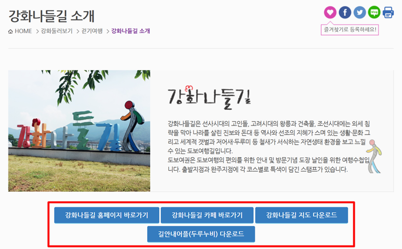 1. 시간 따라 걸을 수 있는 길인 강화나들길은 고인돌 같은 선사시대 흔적부터 고려의 왕릉, 조선의 방어시설까지 자연스럽게 이어져 있어요. 이렇게 강화군청 강화나들길 소개로 들어오면 강화나들길 홈페이지 및 카페 바로가기를 할 수 있고 지도 다운로드하거나 길안내어플도 다운로드도 받을 수 있어요.