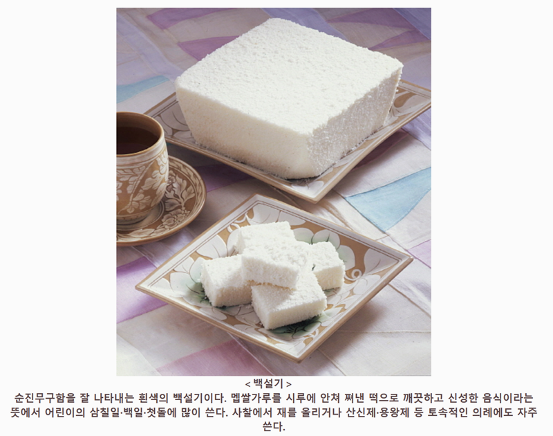 6. 백설기는 순수함을 상징하는 하얀 떡으로 깨끗하고 신성한 음식이라는 의미를 담고 있습니다. 어린이의 삼칠일 백일 첫돌에 많이 사용되며 사찰의 제사나 토속적인 의례에도 자주 쓰입니다.
