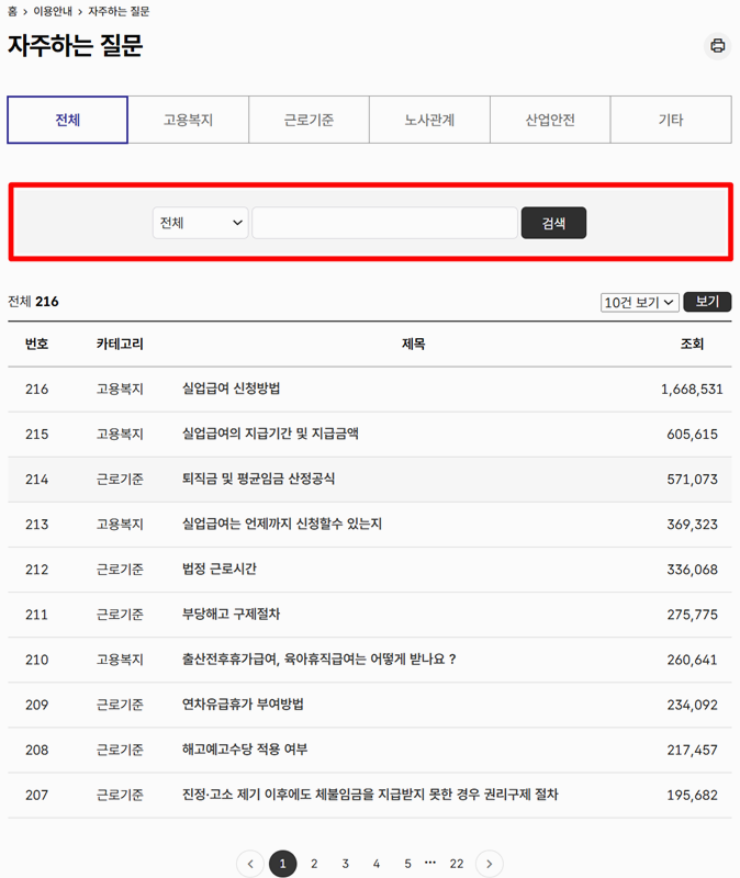 2. 자주하는 질문 게시판은 사람들이 가장 많이 궁금해하는 내용을 한곳에 모아두고 간단하게 설명해주는 공간입니다. 고용복지, 근로기준 같은 주제별로 나뉘어 있고 복잡한 제도도 이해하기 쉽게 정리돼 있어 처음 보는 사람도 편하게 살펴볼 수 있어요. 여기서 퇴직금을 검색합니다.