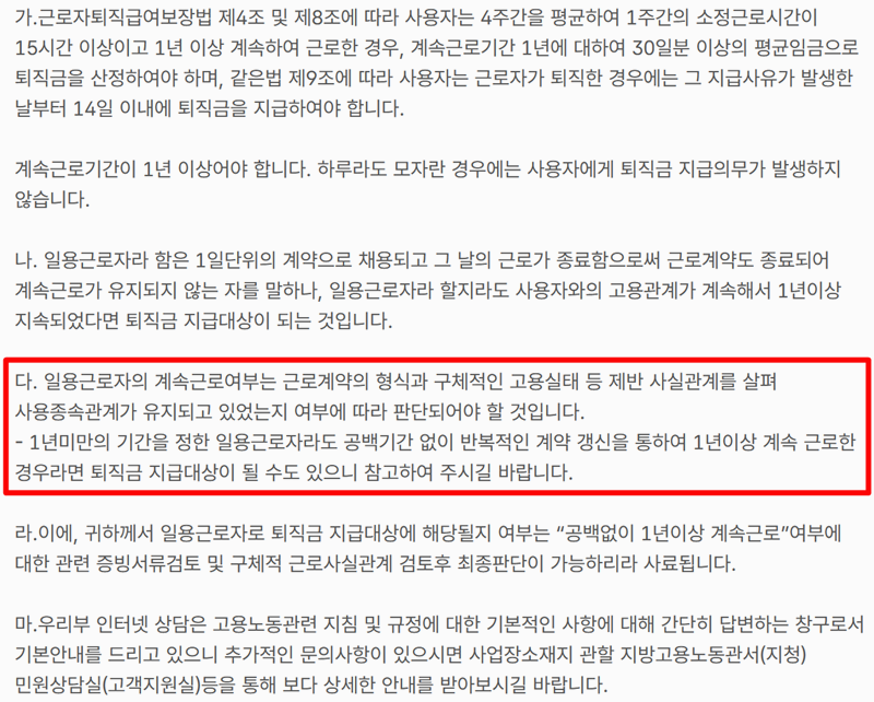 4. 궁금한 질문 중 하나인 1년 미만 퇴직급 지급규정 자격이 되는 경우를 살펴보면 1년 미만으로 계약된 일용직이라도 중간에 쉰 기간 없이 계속 일했다면 퇴직금을 받을 수 있는 가능성이 있습니다. 계약 형식과 무관하게 실제로 고용관계가 끊기지 않고 이어졌다면 퇴직금 대상이 될 수 있으니 근무한 기록을 꼼꼼히 확인하시는 게 좋습니다.