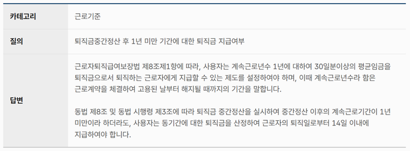 6. 만약퇴직금 중간정산을 했더라도 그 이후의 근무 기간이 1년이 되지 않았다면 그 기간만 따로 계산해 퇴직금을 받을 수 있습니다. 근로계약이 유지된 기간 전체를 기준으로 삼기 때문에 근무한 만큼은 인정받게 되는 겁니다. 퇴사한 날로부터 14일 안에 지급해야 한다는 점도 함께 확인할 수 있어요.