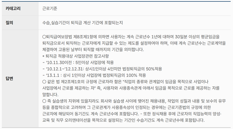 7. 수습이나 실습 기간도 퇴직금 계산에 포함될 수 있습니다. 실제로 일한 기간이고 회사와 일정한 종속관계가 인정된다면 근로자로 보아 전체 근무 기간에 포함하는 방식입니다. 이런 것도 알려줍니다. 실습생이더라도 임금을 받고 정해진 역할을 수행했다면 그 기간도 근속으로 본다는 점이 특징이에요.