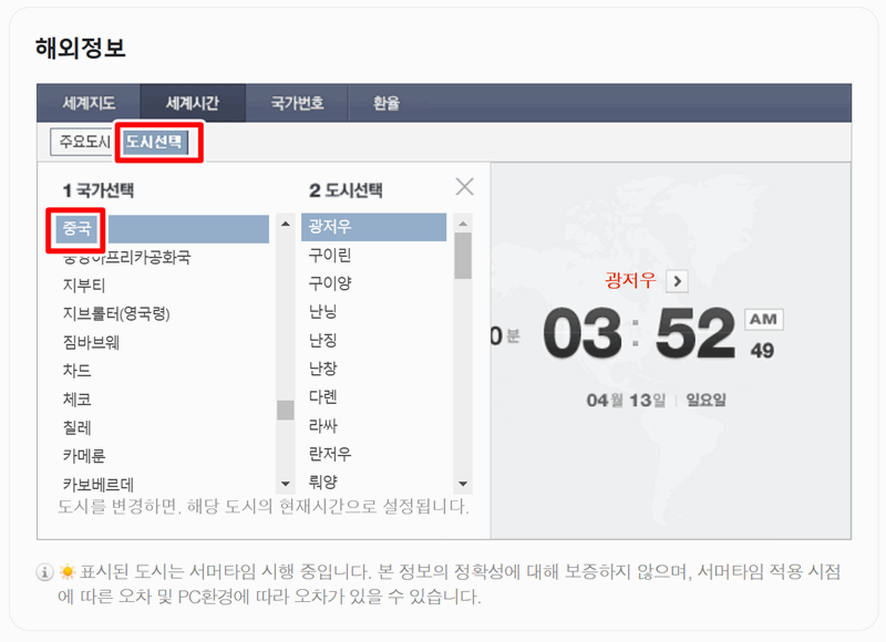 4. 중국의 다른 도시들 시간도 따로 볼 수 있는데요 나라를 중국으로 정하고 도시 이름을 고르면 각 지역의 시간대를 바로 확인할 수 있어요.
