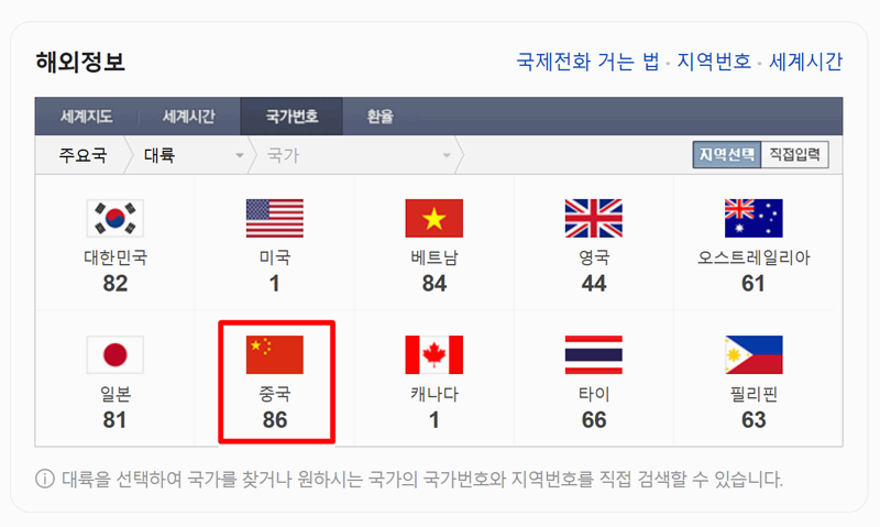 1. 포털 등에서 '국가번호 조회'라고 검색하면 전화 걸 나라를 고르면 바로 국가번호를 알려주는 간단한 페이지가 나와서 편하게 확인할 수 있어요. 기본적으로 중국의 국가번호는 86번인 것을 확인 할 수 있어요.