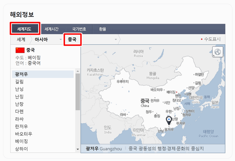2. 중국 전화 지역번호도 확인 할 수 있는데 지역선택에서 중국을 선택하면 지역별로 전화 지역번호를 쉽게 확인할 수 있어요. 광저우는 20, 구이린은 773처럼 도시마다 다르니 통화 전에 번호를 잘 확인해두면 편리합니다.