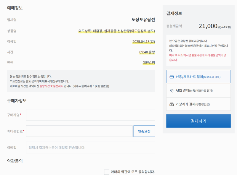 7. 예약을 완료하려면 구매자명 등을 입력하고 약관에 동의해야 합니다. 그런 다음 결제 수단을 선택하고 결제하면 예약이 확정됩니다. 결제는 다양한 방법으로 할 수 있습니다.