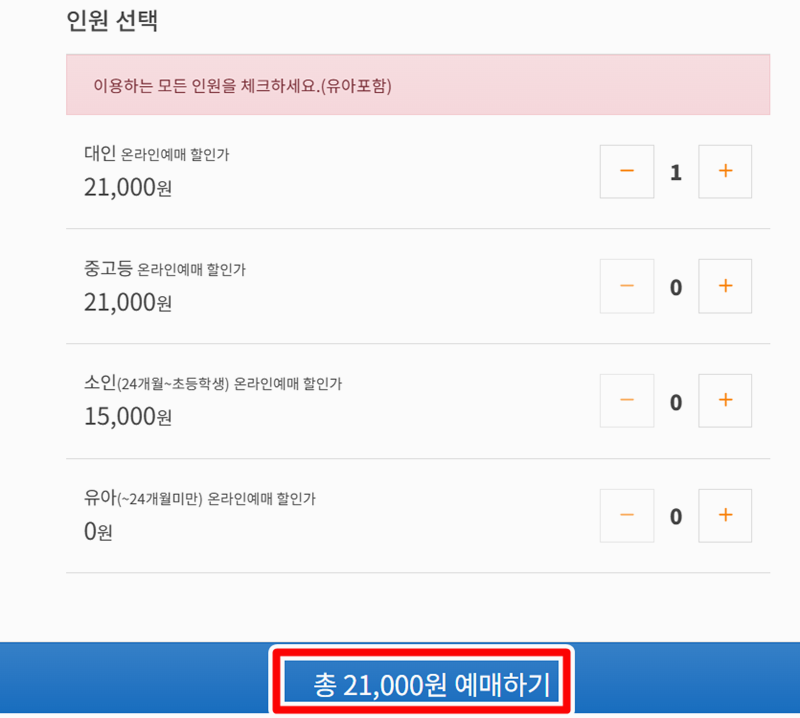 6. 탑승할 인원수를 선택할 때, 대인, 중고등학생, 소인, 유아 등으로 나누어 예약할 수 있습니다. 원하는 인원 수를 정확히 입력한 후 예매하기 버튼을 눌러 예약을 진행하세요.