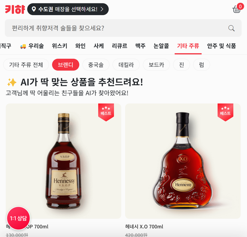 7. 기타 주류 카테고리에서는 브랜디, 데킬라, 보드카 같은 고급 술들이 있어요. 예를 들어, 헤네시 XO, 로이주, 파티쉐 그랑 마니에르 같은 프리미엄 브랜디와 1800 데킬라, 벡터 보드카 같은 고급 양주들을 만나볼 수 있습니다. 다양한 종류의 고급 술들을 쉽게 찾아볼 수 있어요.