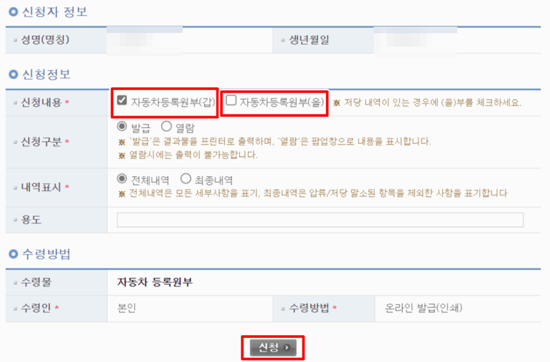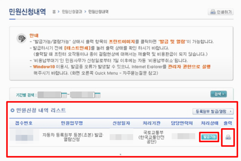 6. 민원 신청 내역에서 발급을 요청하고 출력할 수 있습니다. 발급된 차량 등록원부를 확인하고 출력할 준비를 합니다.