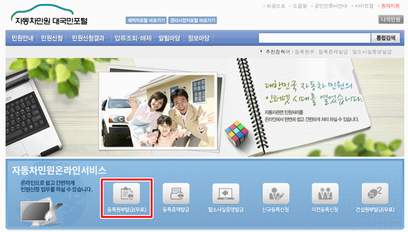 1. 차량 관련 다양한 민원 서비스를 온라인으로 제공하는 사이트입니다. 차량 등록, 번호판 변경 등 여러 절차를 집에서 간편하게 처리할 수 있어 많은 사람들이 이용하고 있습니다. 여기서 등록원부발급(무료)를 선택합니다.