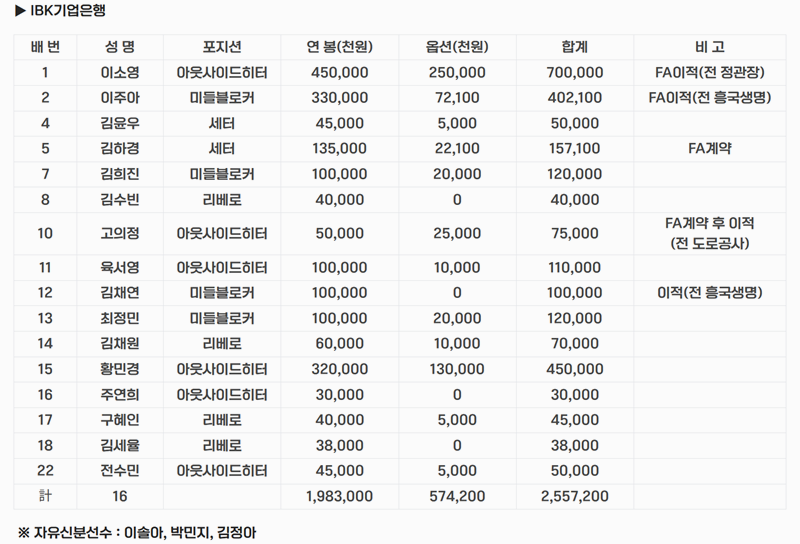 6. IBK기업은행에서 연봉이 가장 높은 선수는 아웃사이드히터 이소영으로 연봉은 450,000천원이며 옵션을 포함한 합계는 700,000천원입니다. 두 번째는 미들블로커 이주아가 연봉 330,000천원 합계 402,100천원으로 2위를 차지하고 세 번째는 아웃사이드히터 황민경이 연봉 320,000천원 합계 450,000천원입니다.