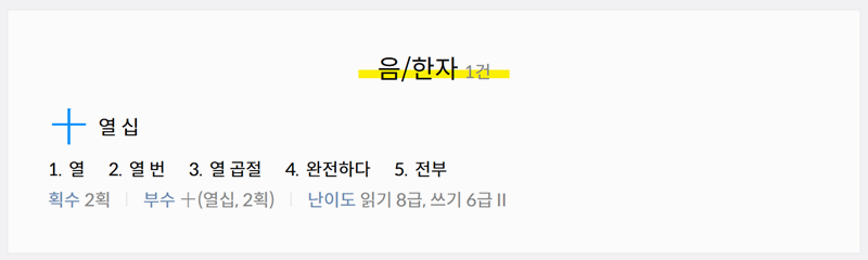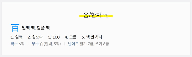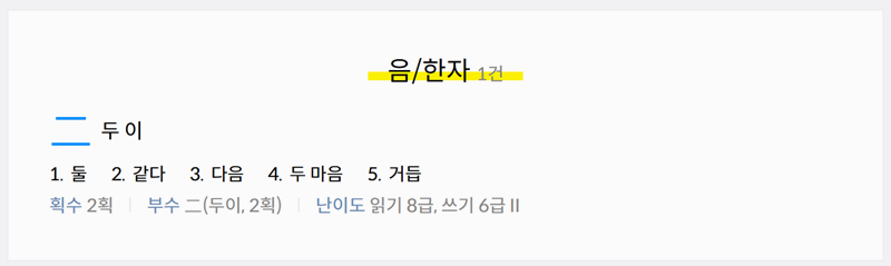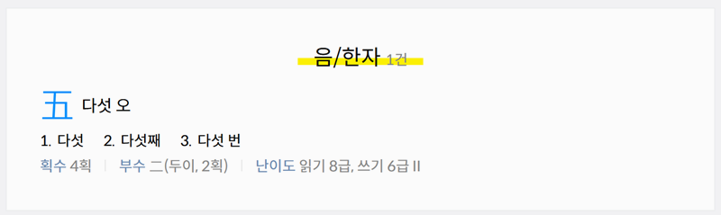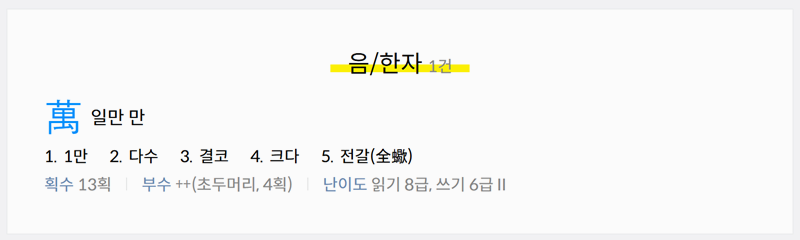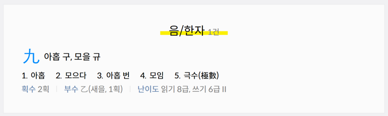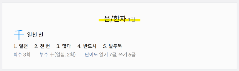 1. 다음 한자사전에 접속해 검색창에 숫자를 입력하면 해당 숫자의 한자와 갖은자, 읽는 법까지 자세하게 확인할 수 있습니다. 쉽게 찾을 수 있어 활용하기에도 편리합니다. 직접 한자를 검색해보시면 더 자세한 뜻과 관련어, 복합어, 숙어 등을 알아볼 수 있습니다.