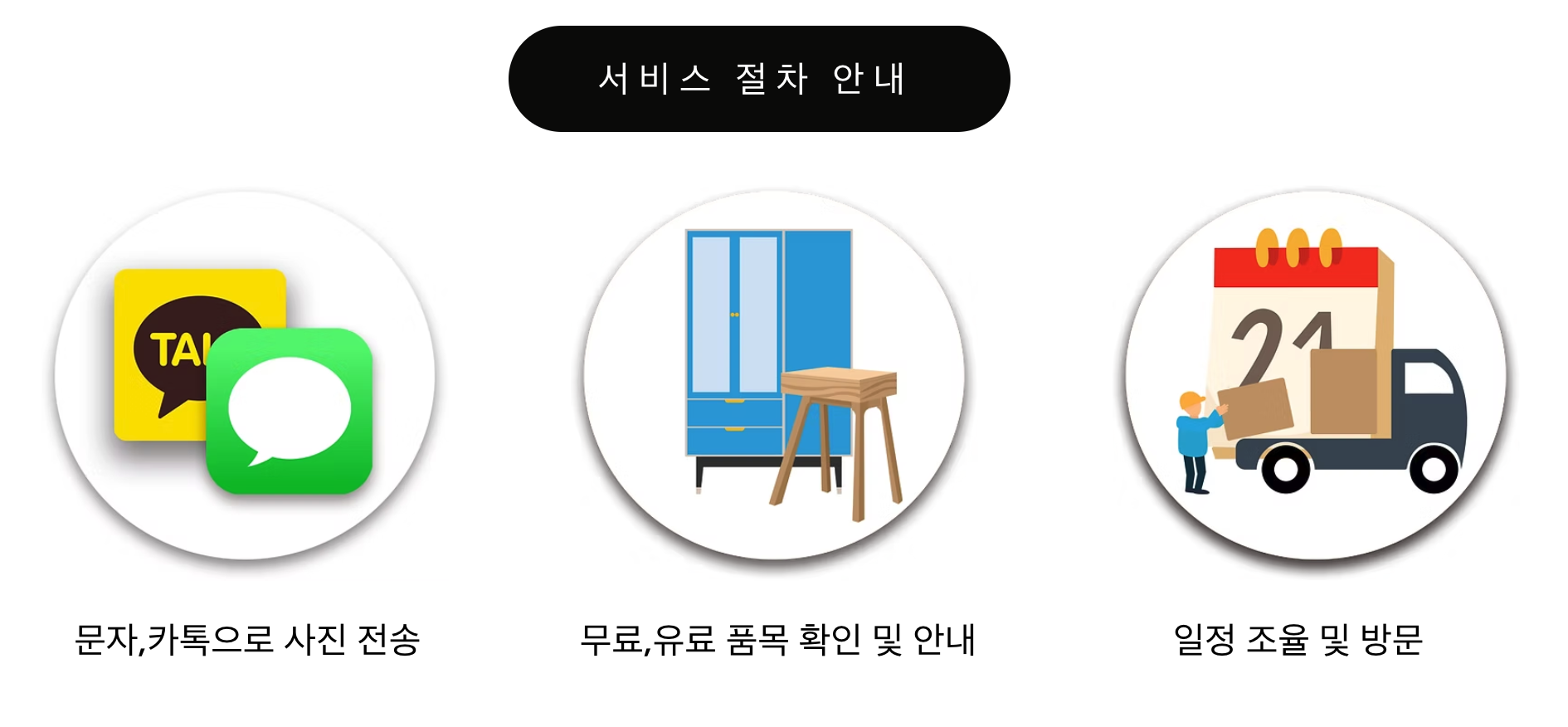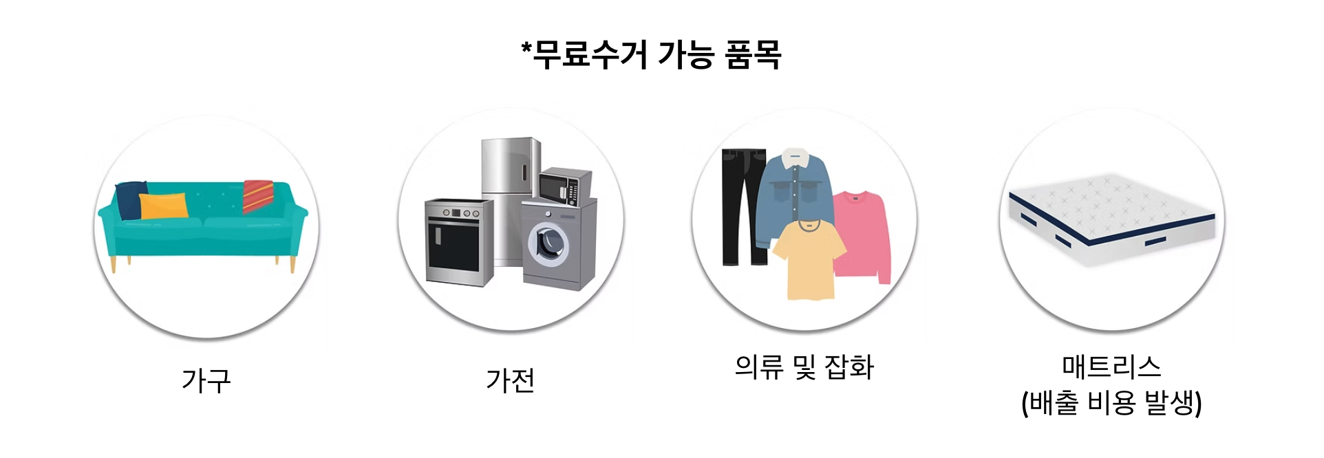 6. 단 고장이나 큰 흠집 없이 연식도 오래되지 않아 재사용 가능한 물건이어야 무료수거가 가능해요. 만약 조건에 맞지 않는다면 유료배출 서비스를 이용하시면 돼요. 무거운 물건을 직접 치우느라 고생하지 않아도 되고 알아서 가져가니 훨씬 수월합니다.