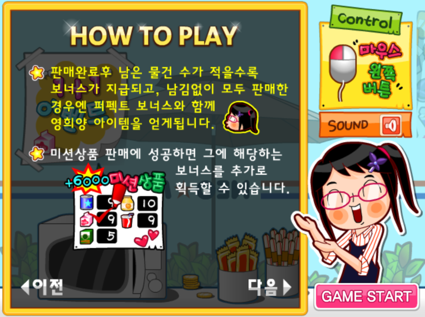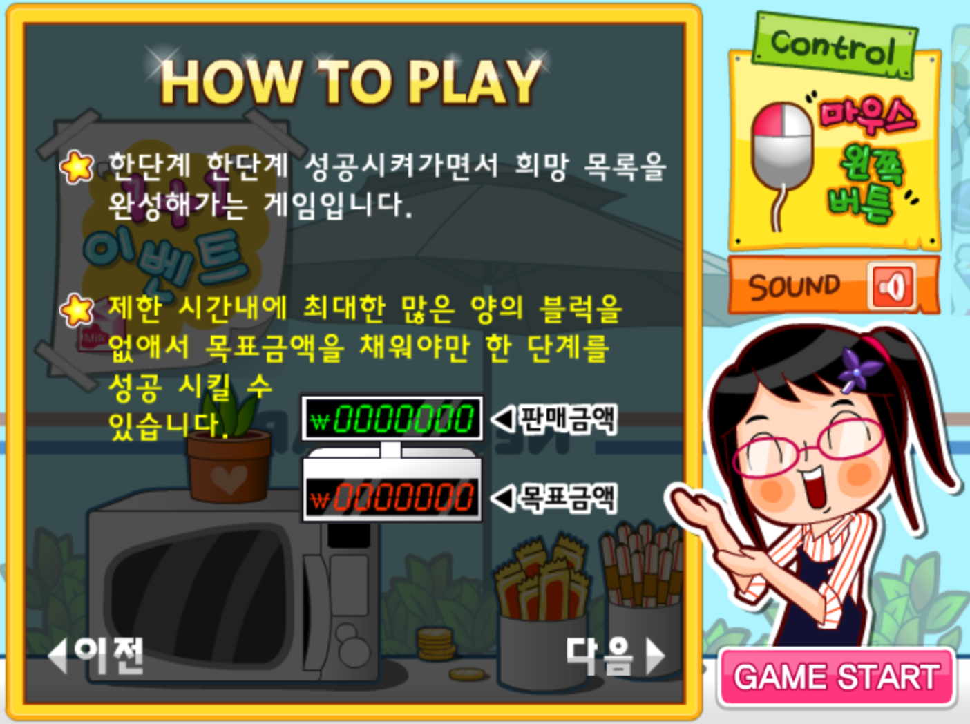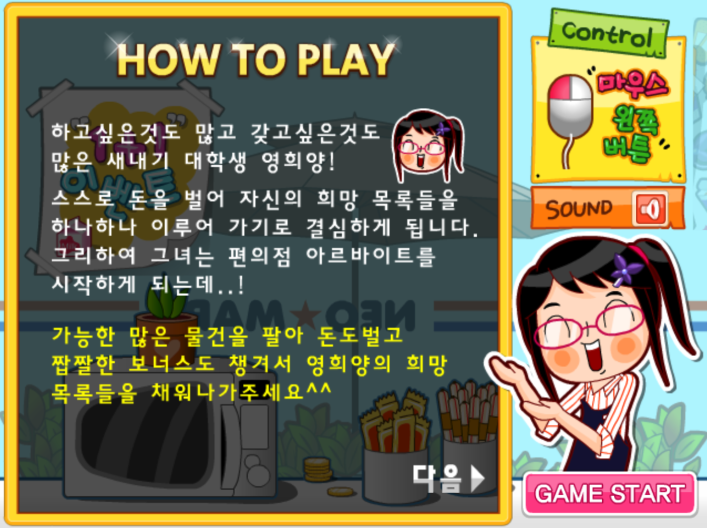 2. 이 게임은 새내기 대학생 영희가 직접 돈을 벌어가며 자신의 희망 목록을 완성해가는 이야기예요. 가능한 한 많은 물건을 팔아 돈을 모으고 보너스도 챙겨가면서 영희의 목표를 이루어가는 흐름이라서 단순하지만 은근히 몰입하게 되는 재미가 있어요.
