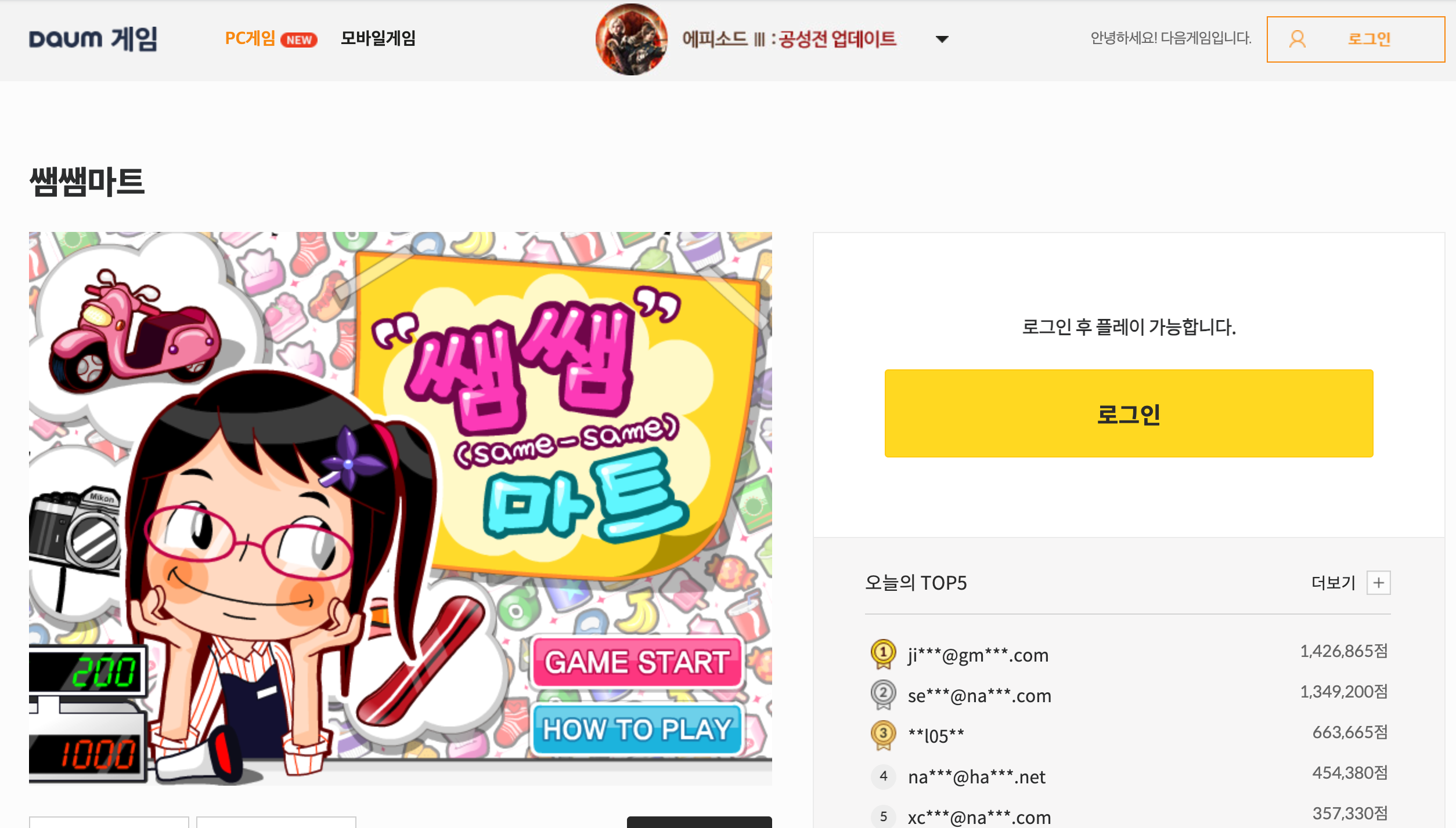 1. 쌤쌤마트 바로가기로 들어가면 처음에 로그인 화면이 보여요. 여기서 카카오 계정으로 로그인해야 게임을 시작할 수 있어요. 로그인만 하면 바로 GAME START 버튼이 떠서 가볍게 눌러주면 게임이 시작됩니다. 오늘의 TOP5에 이름 올리는 것도 은근히 재미있으니까 한 번 도전해보셔도 좋아요.
