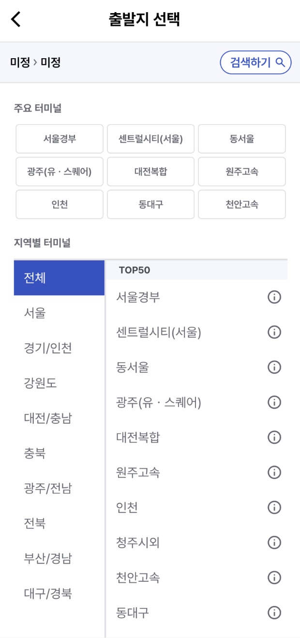 3. 앱을 켜면 출발지와 도착지, 출발 날짜를 설정하는 화면이 나와요. 각각 입력하고 조회하기를 누르면 예약 가능한 버스 목록이 한눈에 확인돼서 이동시간이나 종류를 비교해볼 수 있어요.