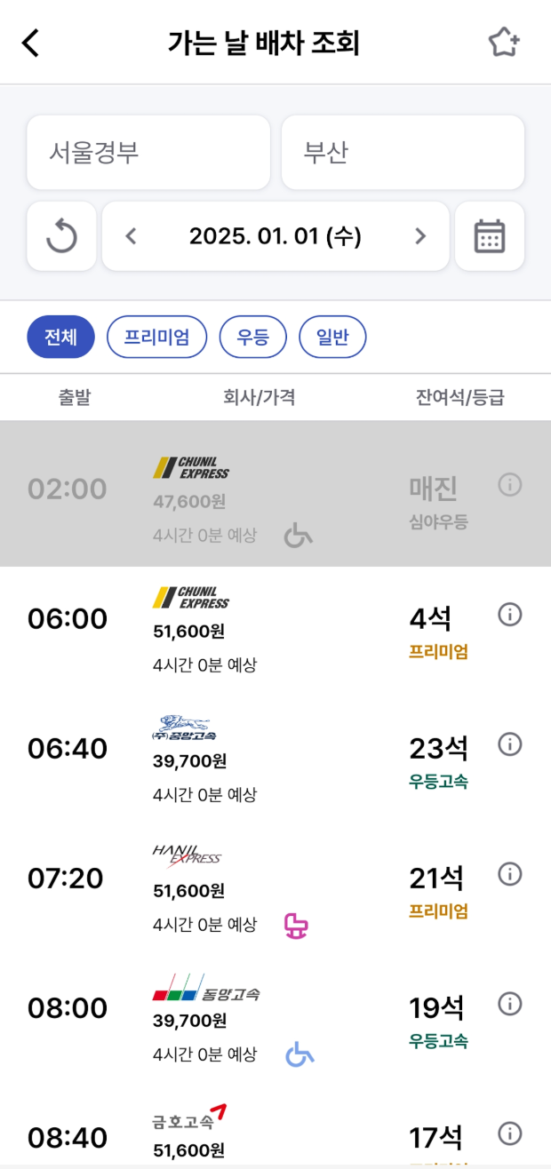 4. 목록에 나온 버스들 중에서 출발 시간을 꼼꼼하게 확인하고, 좌석이 남아있는 버스를 골라주면 돼요. 남은 좌석 수까지 표시돼서 실시간으로 확인할 수 있으니 원하는 시간대에 맞춰 고르면 됩니다.