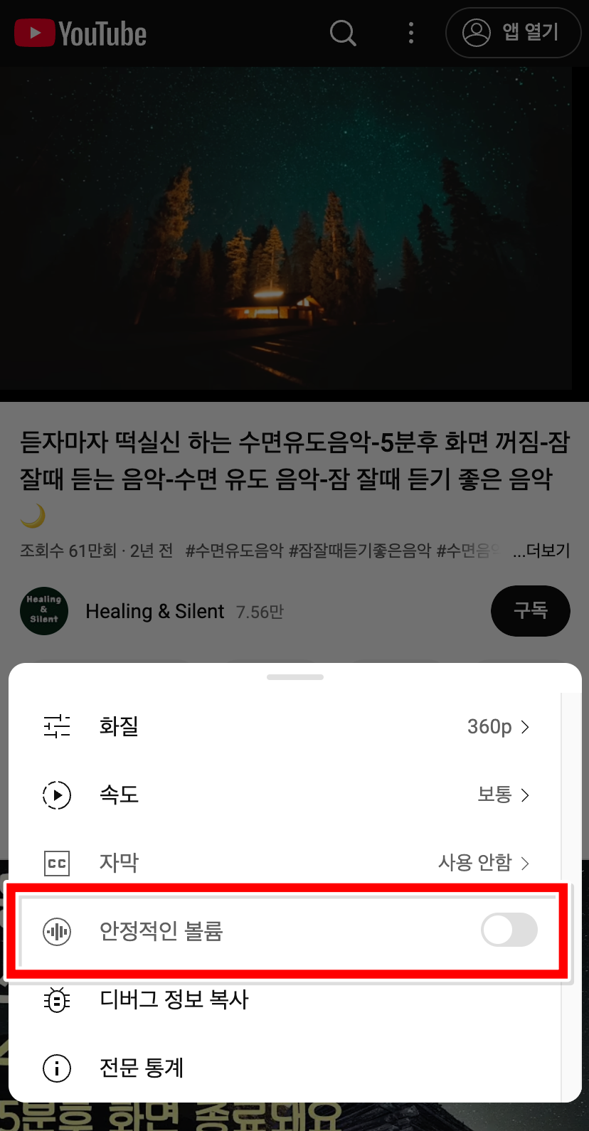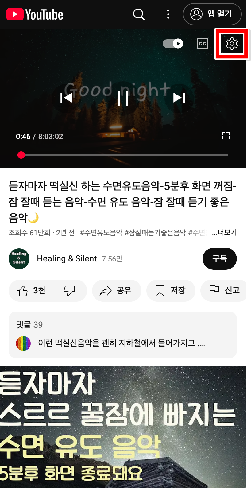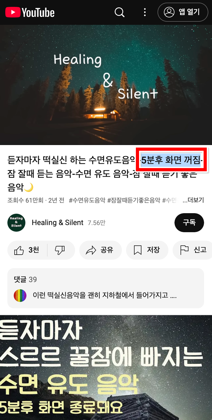 3. 제가 개인적으로 가장 추천드리고 싶은 건 5분 뒤 화면 꺼짐 영상이에요. 영상은 재생되면서 음악만 나오고 화면은 자동으로 꺼지니까 배터리 걱정 덜고 스마트폰이 덜 뜨거워져서 편하게 잠들 수 있답니다.