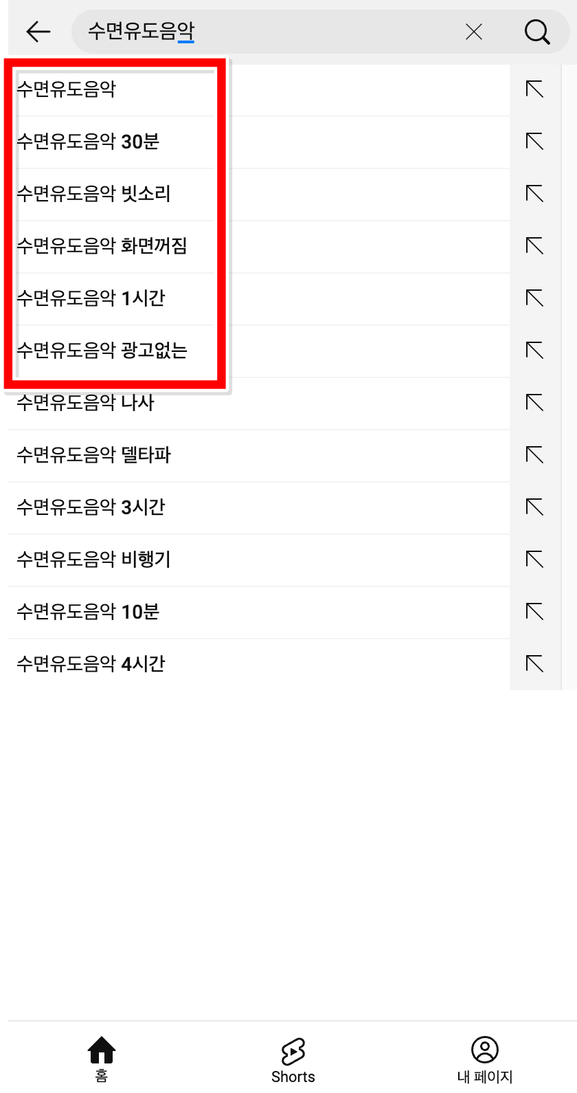 1. 유튜브로 들어가셔서 검색창에 수면유도음악이라고 입력해보세요. 빗소리, 화면꺼짐, 1시간, 광고없음 같은 단어를 함께 넣으셔도 좋아요. 본인이 원하는 분위기나 시간대에 따라 검색어를 살짝 바꿔보면서 마음에 드는 영상을 찾는 것도 추천드려요.