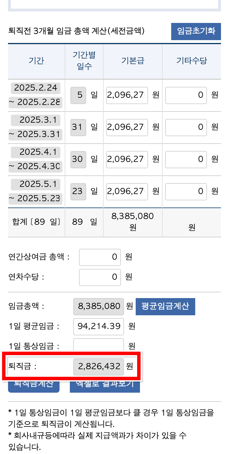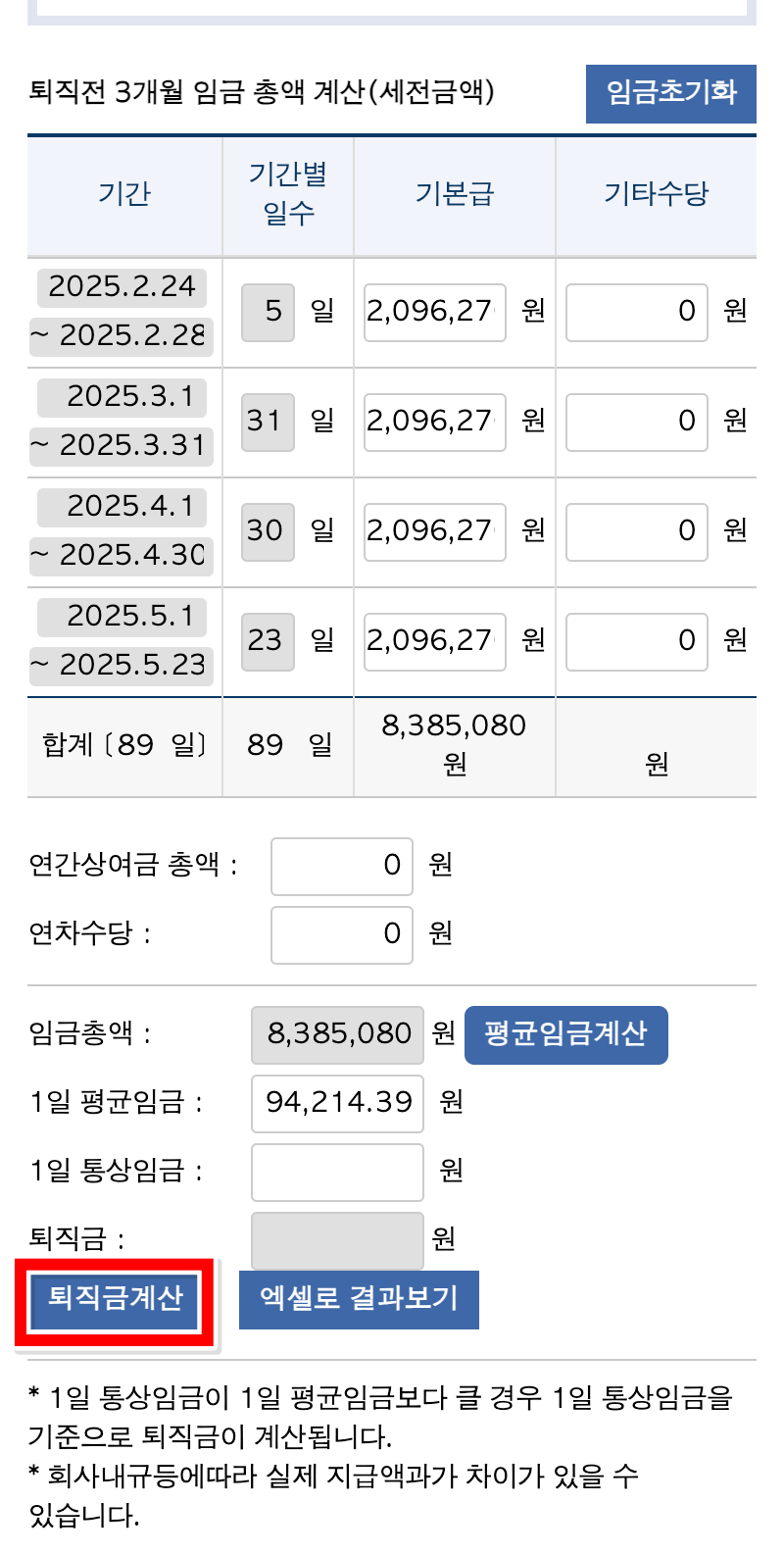 5. 평균임금이 계산되면 그 수치가 바로 아래에 표시됩니다. 이걸 확인하고 퇴직금 계산이라는 항목을 눌러주시면 예상 퇴직금이 어떻게 되는지 결과가 바로 정리돼서 화면에 나타나요. 계산 과정도 깔끔하고 보기 편해요.
