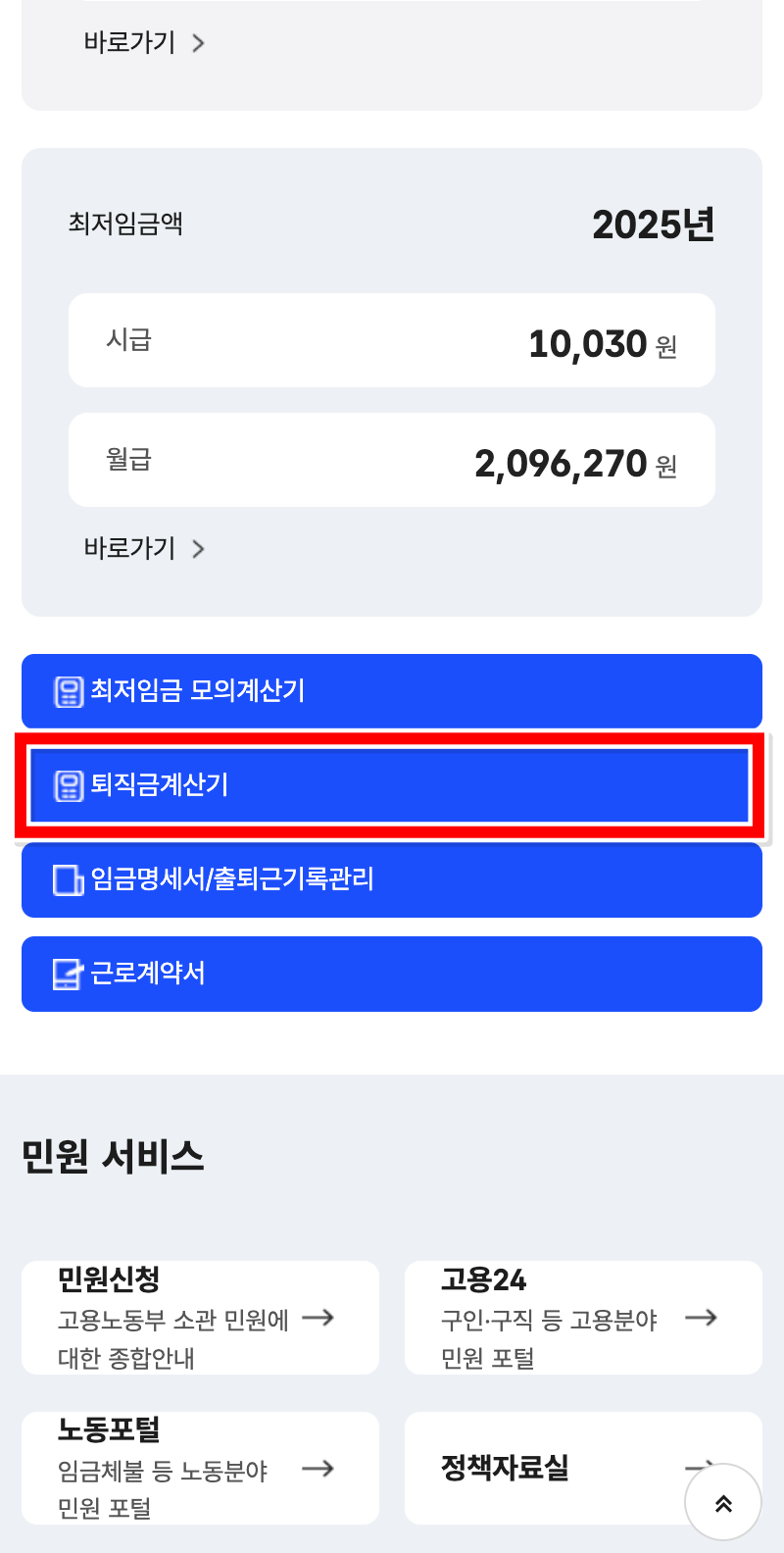 1. 고용노동부 공식 홈페이지에 접속하신 다음 메인화면을 천천히 내려보세요. 그러면 스크롤을 조금만 내렸을 때 화면 중간쯤에 퇴직금 계산기라는 메뉴가 눈에 들어올 거예요. 복잡하게 찾지 않아도 쉽게 보이는 위치에 있어 편하게 이용하실 수 있어요.