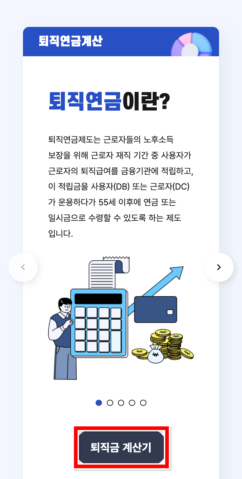 2. 퇴직금 계산기 메뉴를 누르면 퇴직연금에 대한 설명과 정책 안내가 먼저 나옵니다. 내용을 잠깐 읽어보셔도 좋고 바로 아래로 내려보면 퇴직금 계산기라는 안내 문구와 함께 누를 수 있는 항목이 따로 있어요. 그 부분을 눌러주세요.