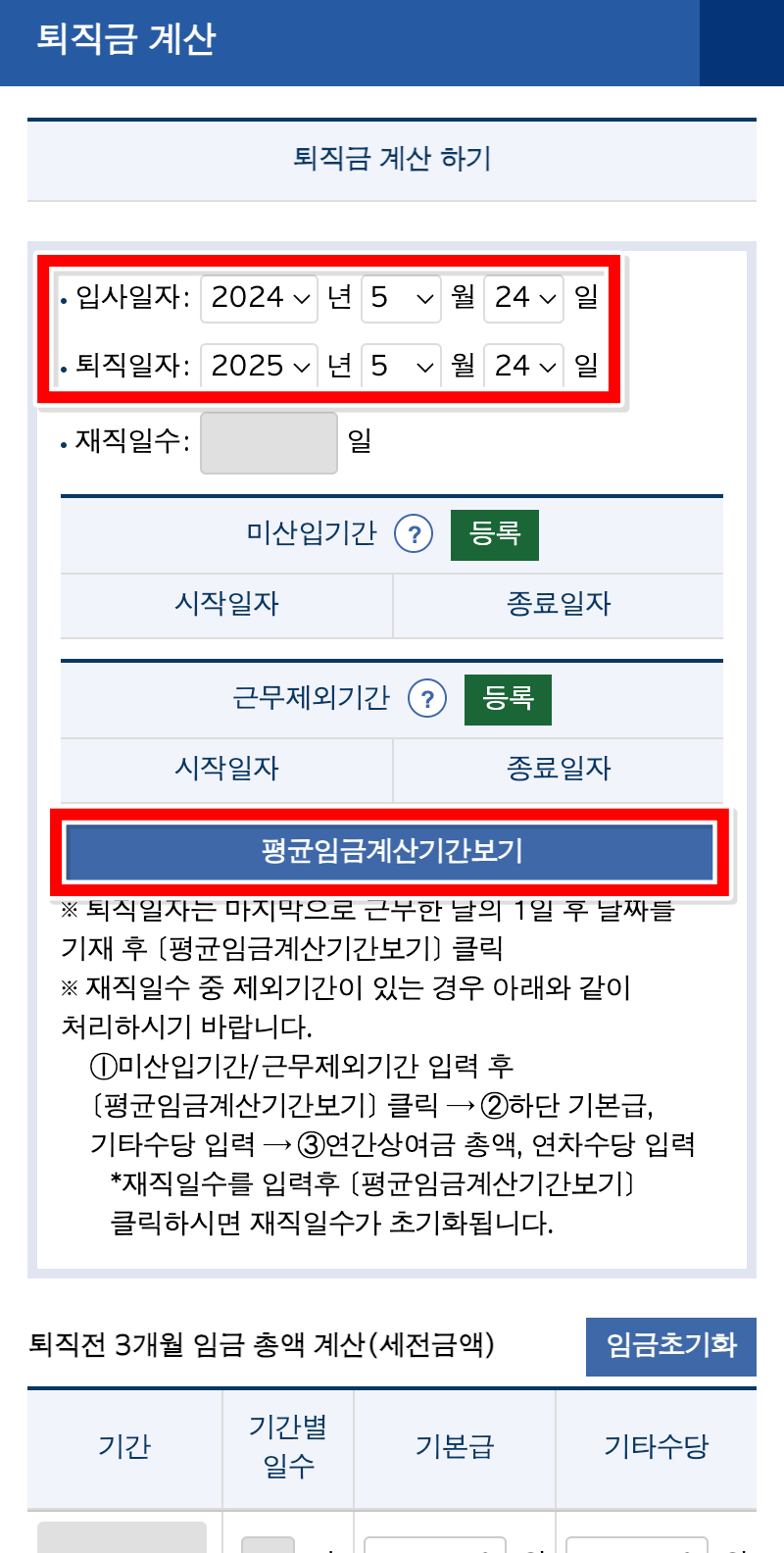3. 계산기 화면으로 이동하면 제일 먼저 입사일과 퇴사일을 입력하는 칸이 보여요. 이 부분은 꼭 실제 근무한 기간을 기준으로 정확하게 입력해주셔야 해요. 날짜를 입력하고 평균임금 계산기간 보기를 눌러서 다음 단계로 넘어가면 됩니다.