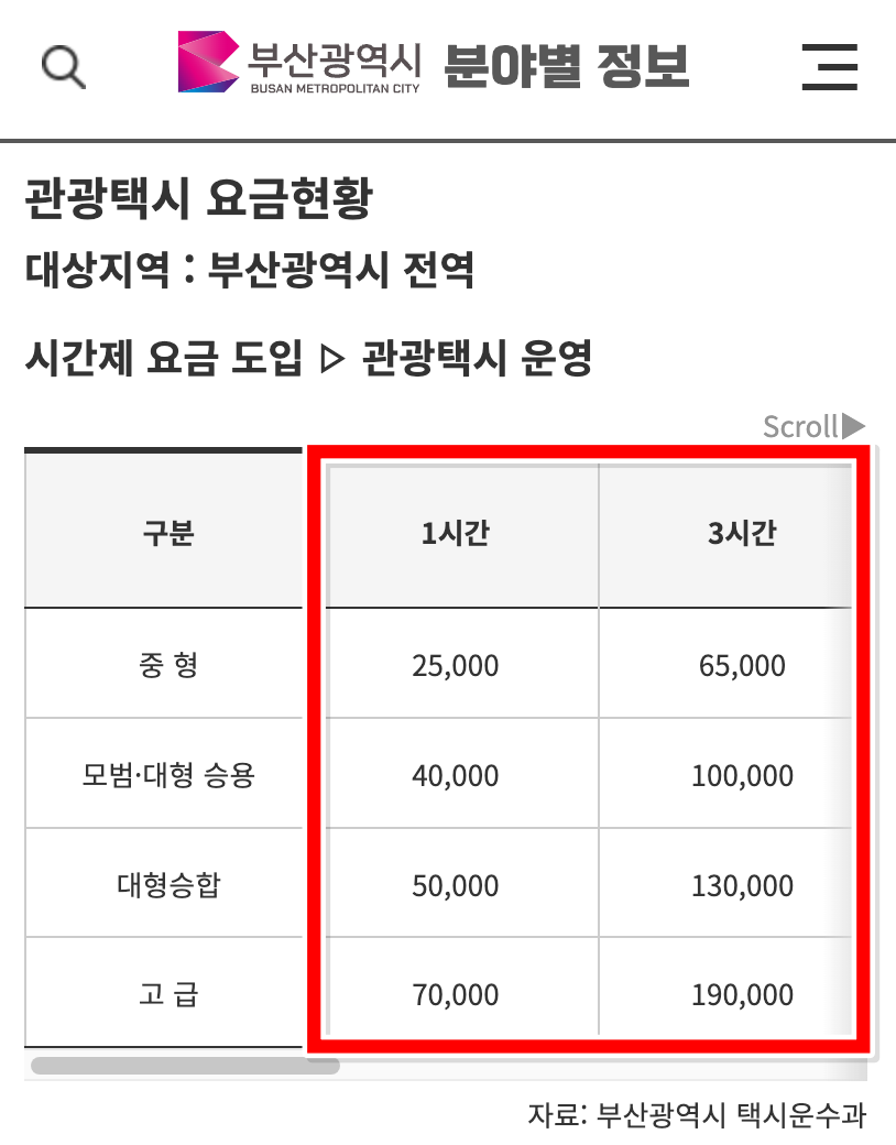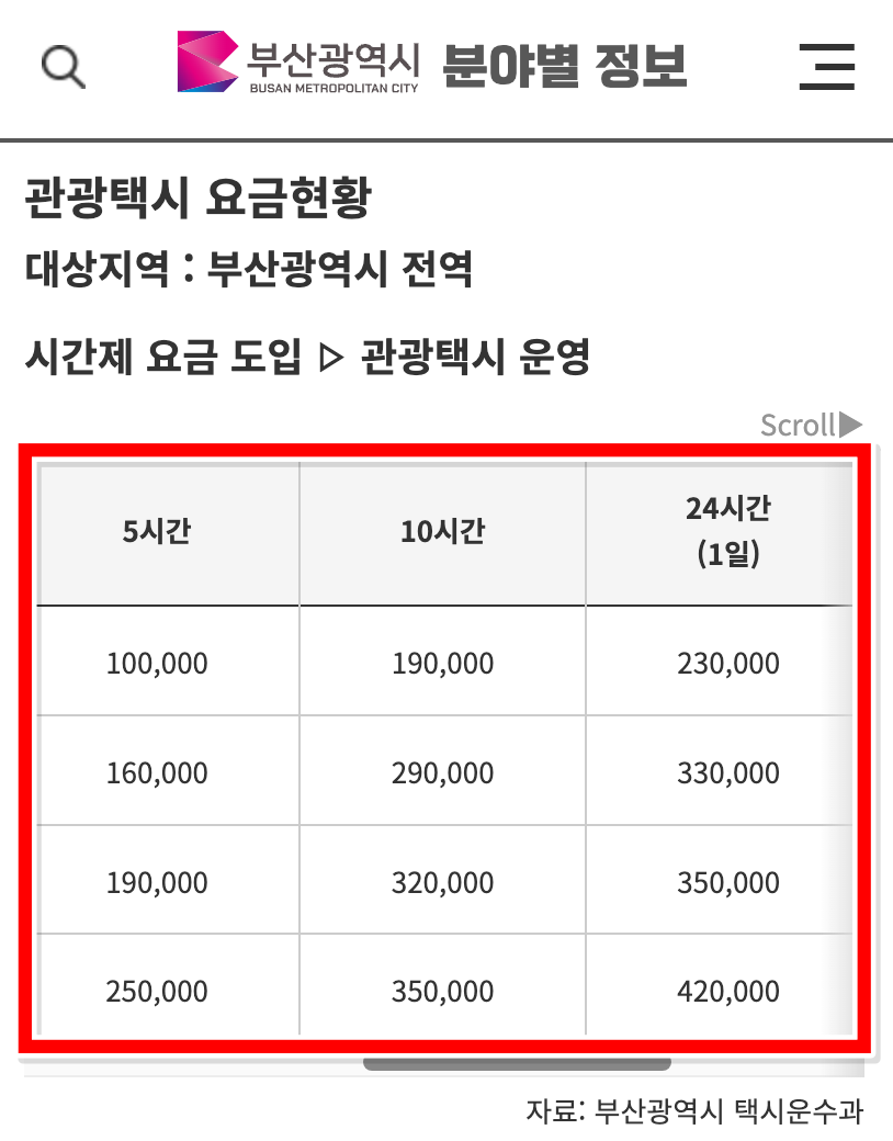 5. 관광택시 요금은 시간에 따라 달라지는 시간제 요금이 도입되어 있으므로, 택시 이용 시 예상 요금을 미리 계산해 놓으 시는 것이 좋습니다.