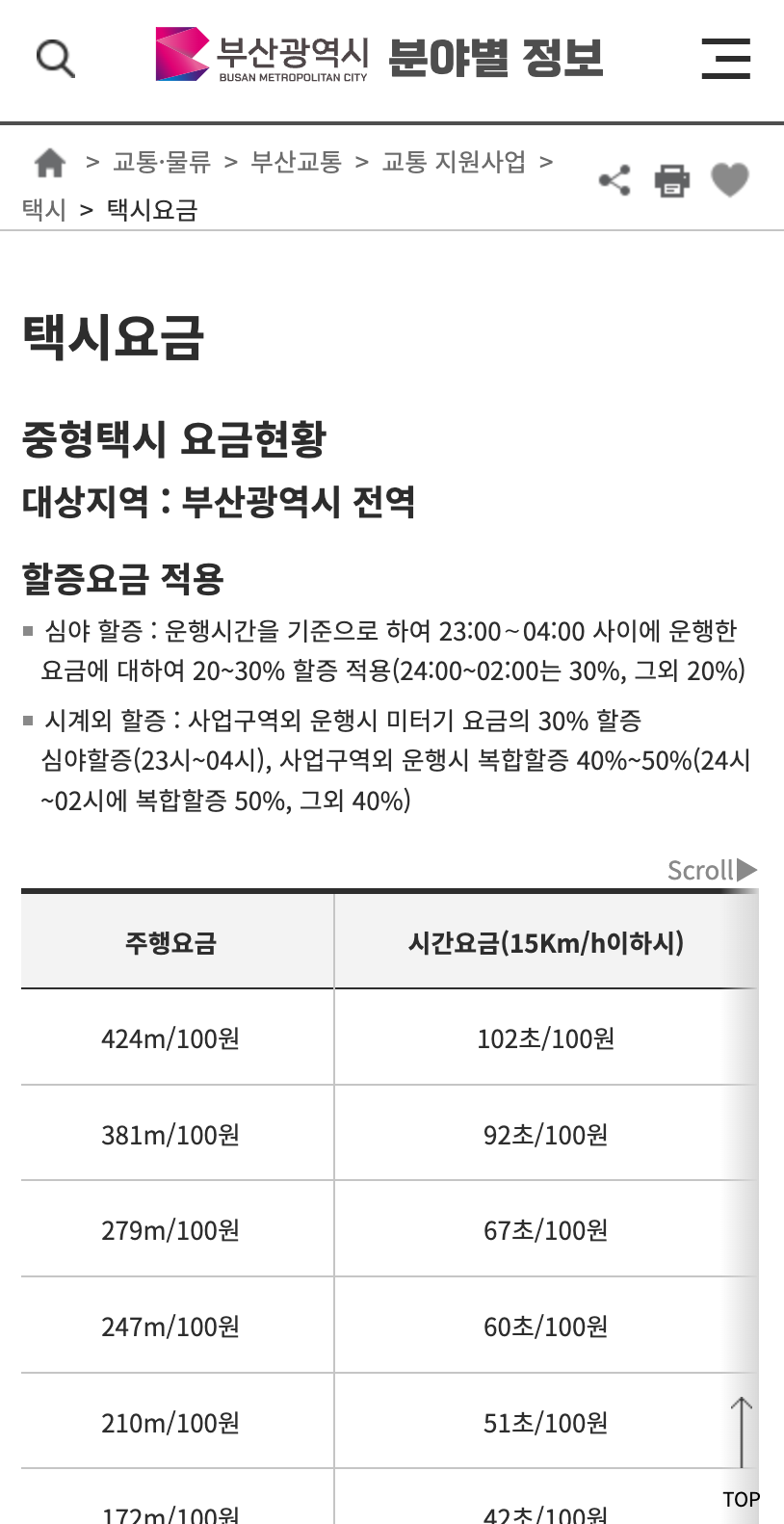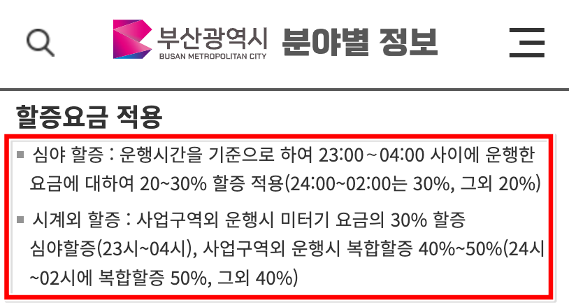 1. 부산광역시의 택시 요금현황을 투명하게 공개하고 있어요. 심야할증 및 시계외 할증 등 할증요금 적용과 모범 및 대형택시 요금도 확인해볼 수 있어요.