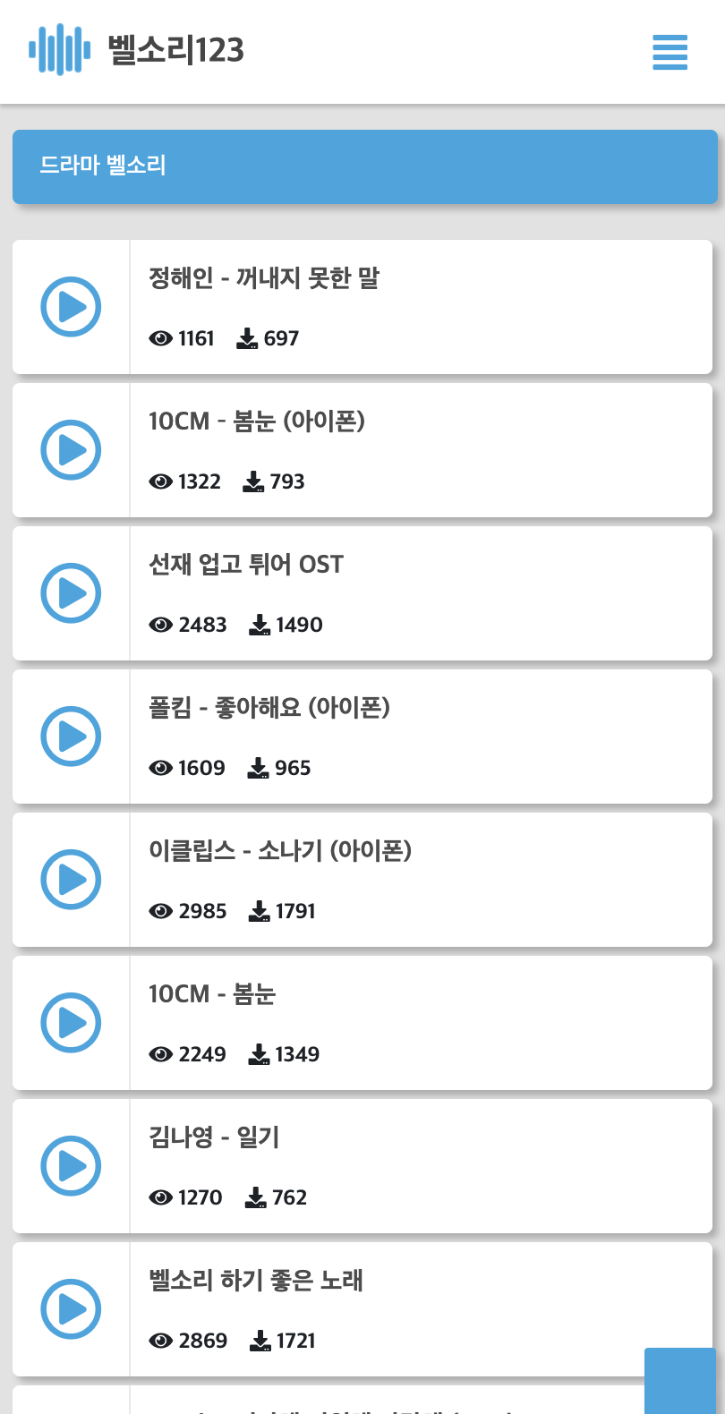 오늘 소개할 벨소리 무료다운받는곳 사이트는 다양한 장르의 벨소리를 제공하며, 사용자가 원하는 소리를 쉽게 찾을 수 있도록 구성되어 있습니다. 특히 최신 인기곡부터 드라마 OST 까지 다양한 장르의 선택지를 제공하여, 개개인의 취향에 맞는 벨소리를 찾아 볼 수 있어요. 원하는 벨소리 찾는 방법까지 소개해드릴게요. 아래의 벨소리123 홈페이지에서 받을 수 있습니다.